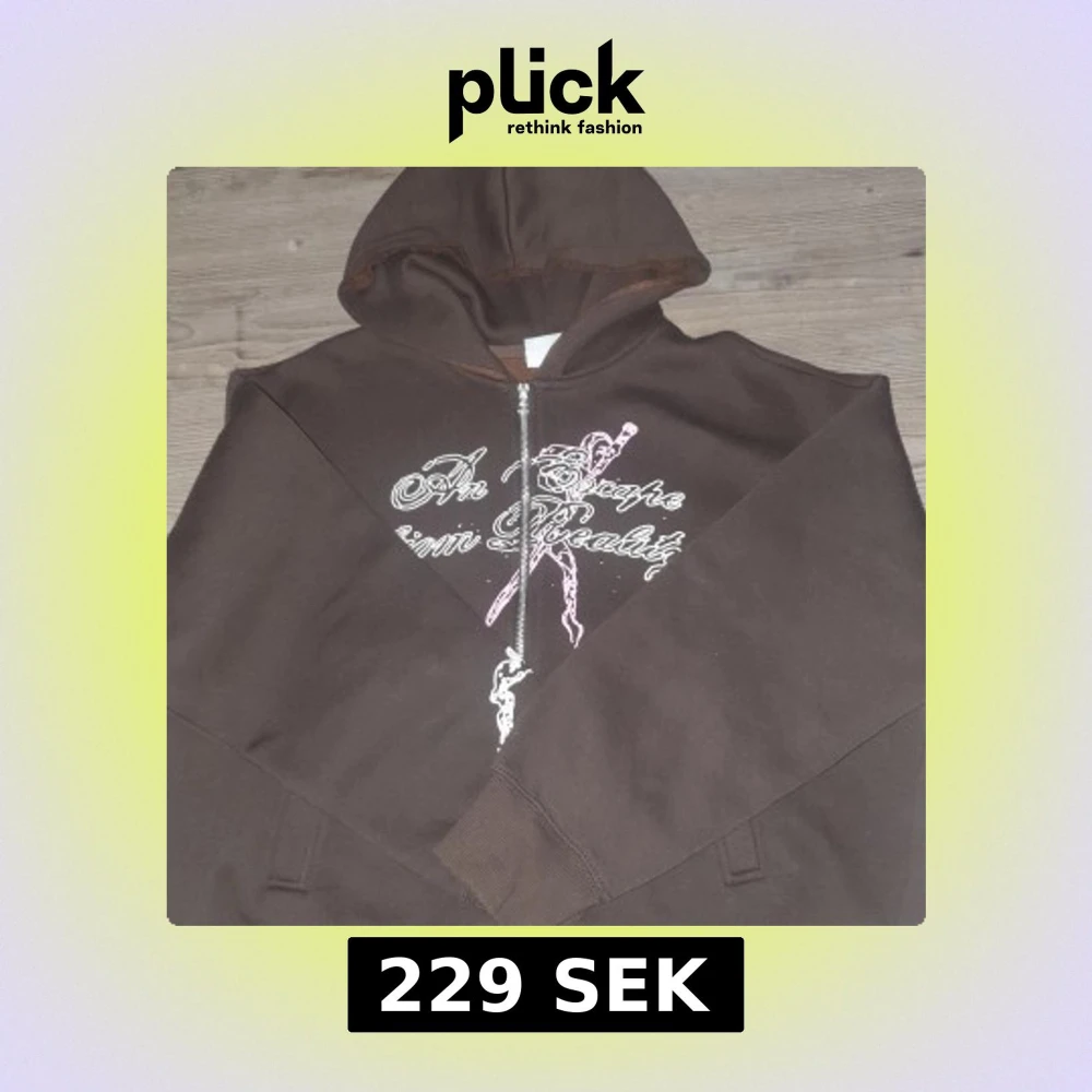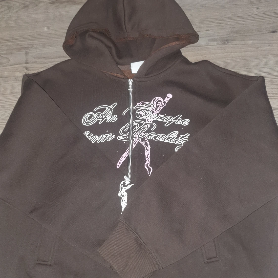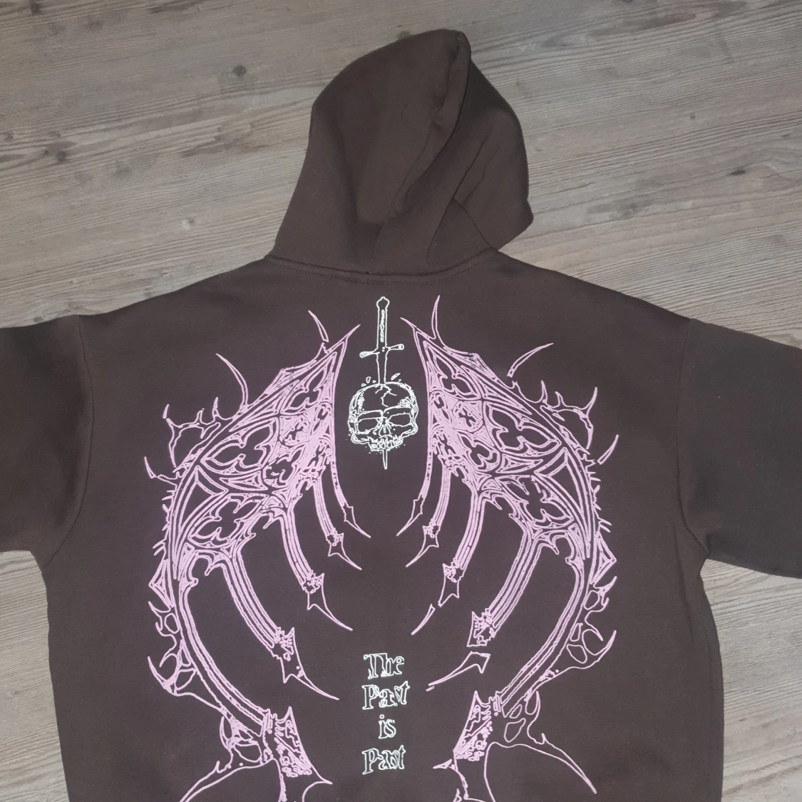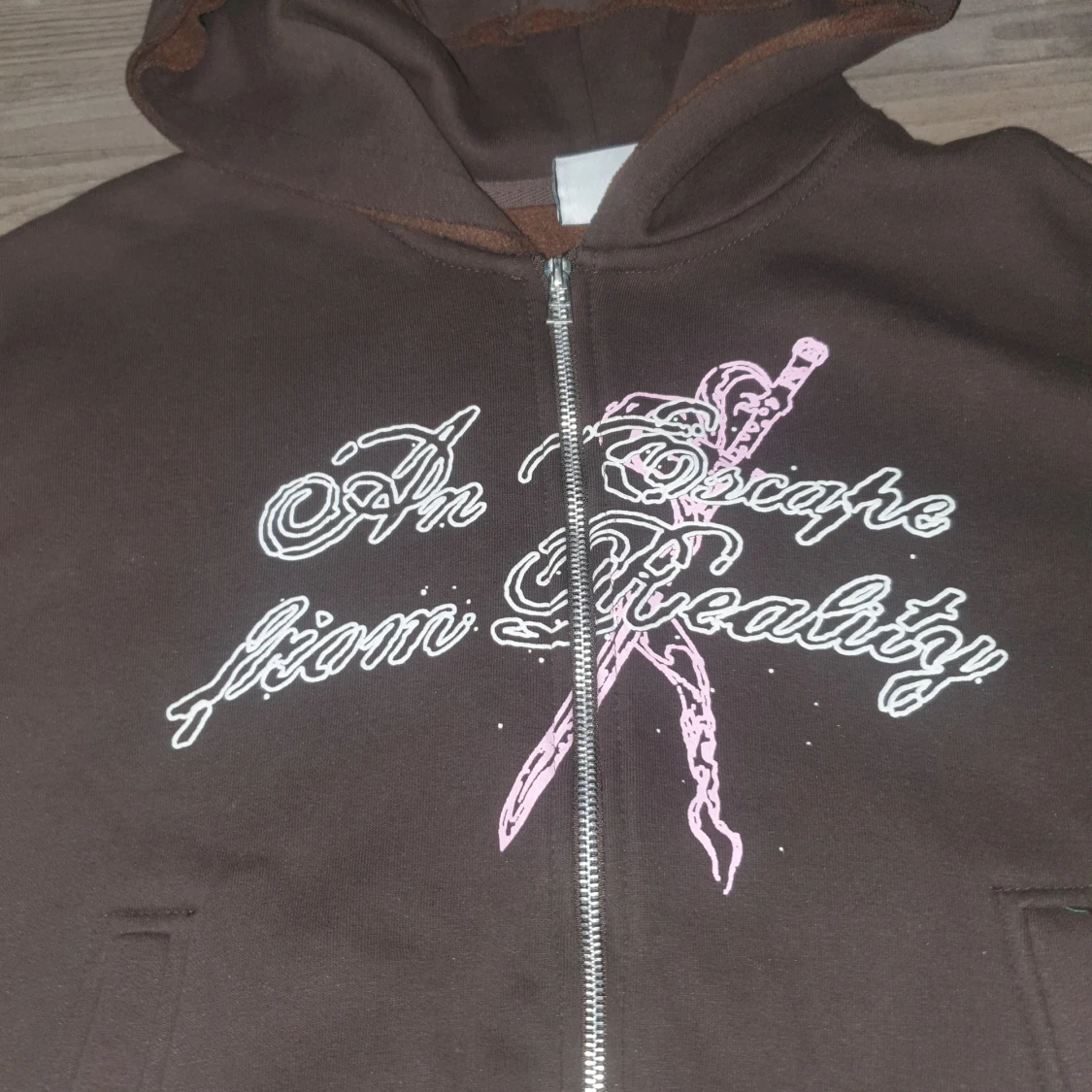 Snygg brun hoodie med huva och dragkedja framtill. Framsidan har ett vitt och rosa tryck med texten 'An Escape from Reality' och en grafisk illustration. Baksidan har ett stort rosa och vitt motiv med döskalle och texten 'The Past is Past'. Perfekt för dig som gillar edgy streetwear.