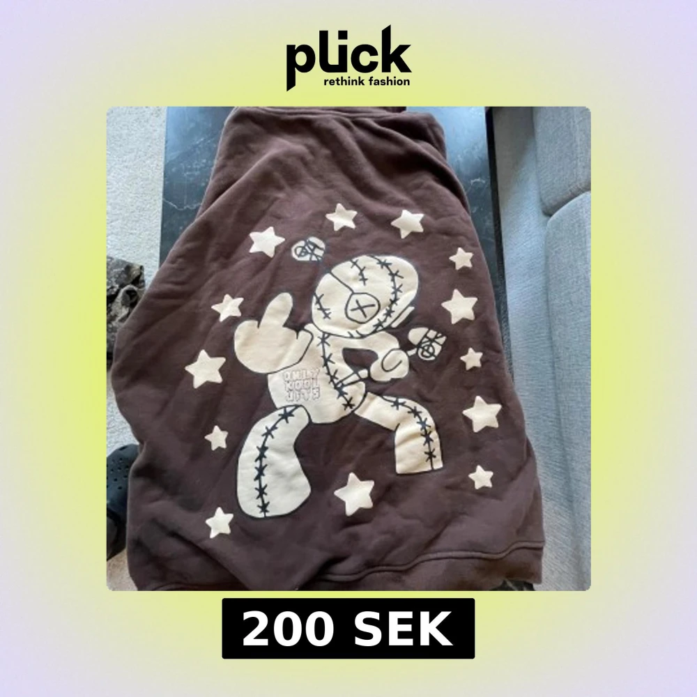 Säljer en brun hoodie från Only Kool Jits med stor grafisk print på ryggen av en tecknad figur omgiven av stjärnor och texten 'ONLY KOOL JITS' på framsidan. Hoodien har huva och känguruficka, trycket är i beige och ger en unik streetwear-vibe.
