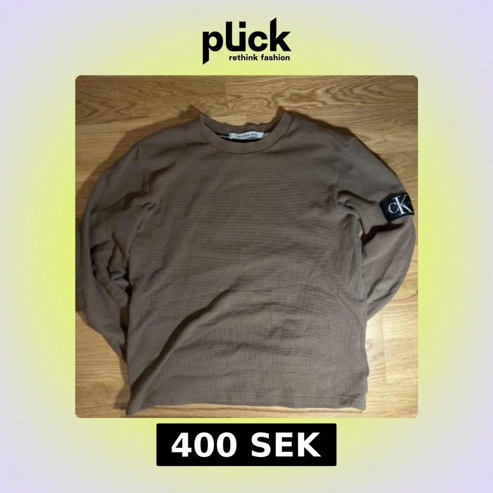 Säljer en stilren brun långärmad tröja från Calvin Klein Jeans. Tröjan har en diskret textur och ett svart märke med CK-loggan på ärmen. Perfekt för en avslappnad och trendig look.