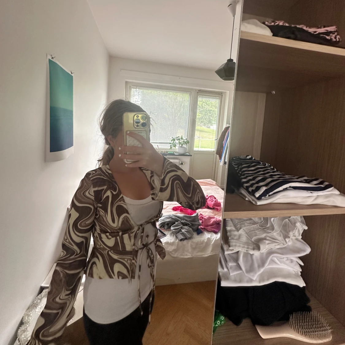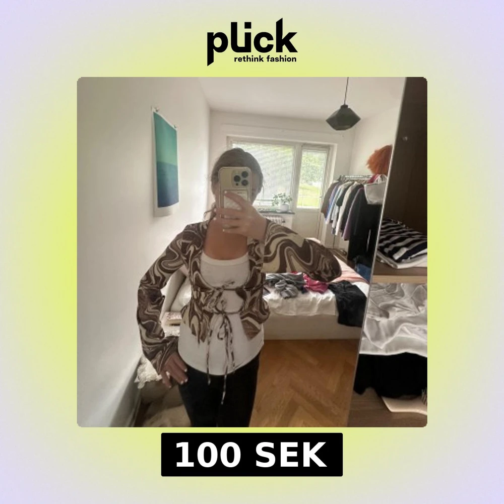 Säljer en snygg brun och beige overshirt med swirl-mönster och knytning framtill. Jackan har långa ärmar och croppad passform, perfekt för att lyfta vilken outfit som helst. Materialet känns mjukt och följsamt, och den unika designen gör den till ett riktigt statement-plagg.