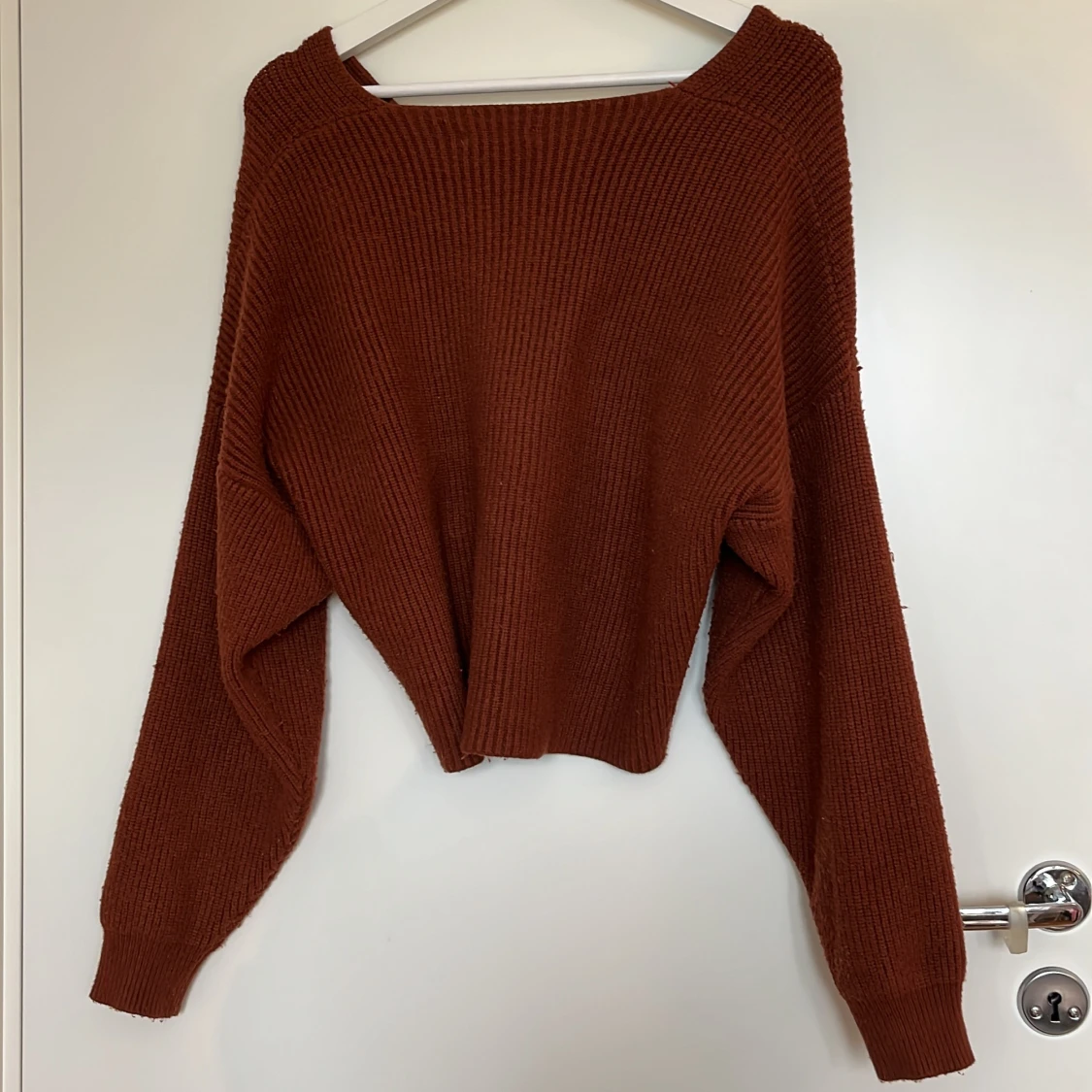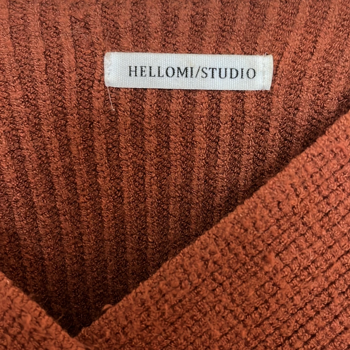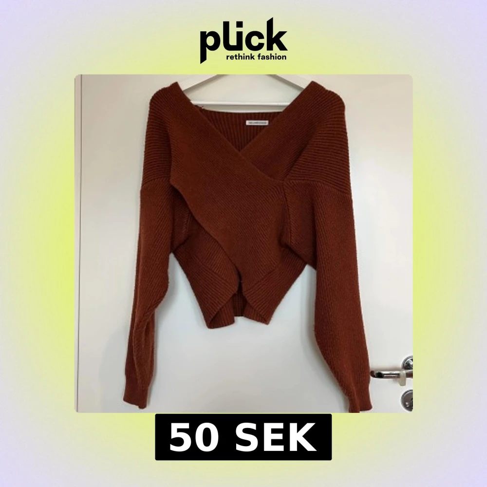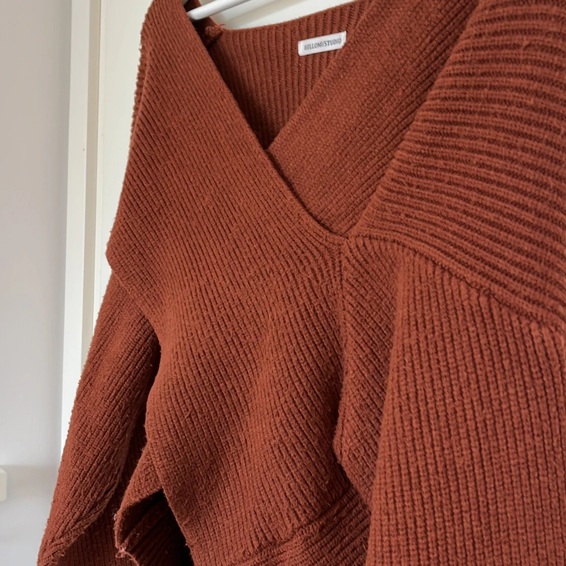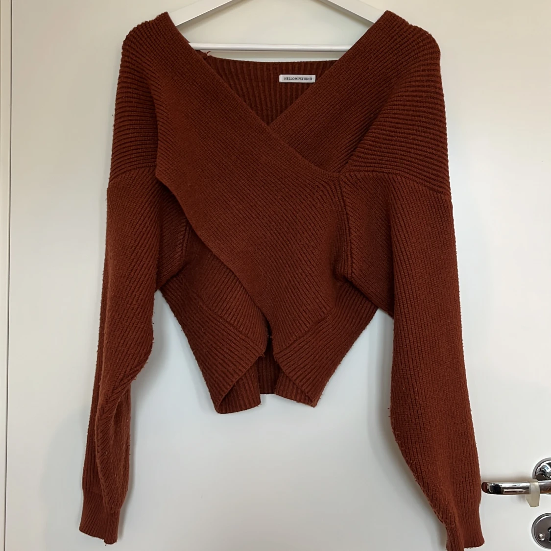 Snygg brun stickad tröja från Hellomi Studio med omlott-design och v-ringad hals. Tröjan har lång ärm, ribbad struktur. *Tröjan är lite nopprig men har försökt att ta bort det värsta. Om fler bilder efterfrågas, skicka dm :)