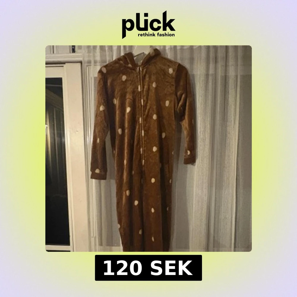 Supermysig brun onepiece från Lindex med vita prickar, dragkedja framtill och huva med stora ögon och horn. Tillverkad i mjuk fleece, perfekt för chilliga dagar eller som rolig djuronesie. Långärmad och helkroppsmodell för extra komfort.