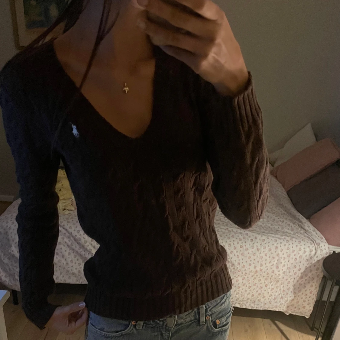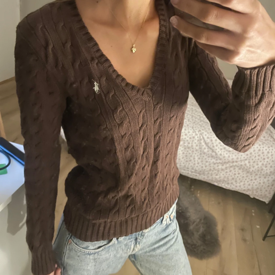 Brun stickad tröja med v-ringning från Ralph lauren