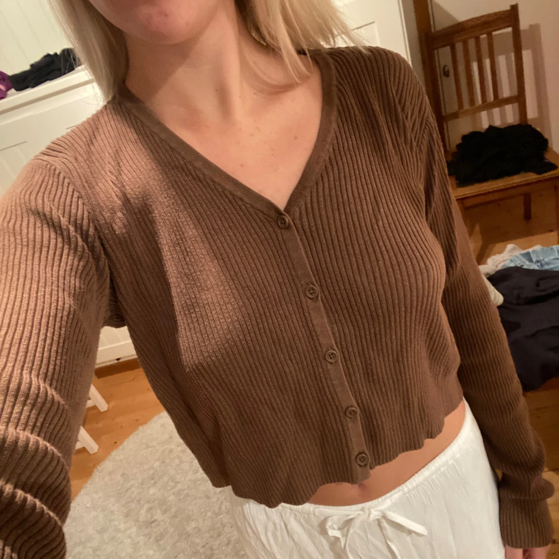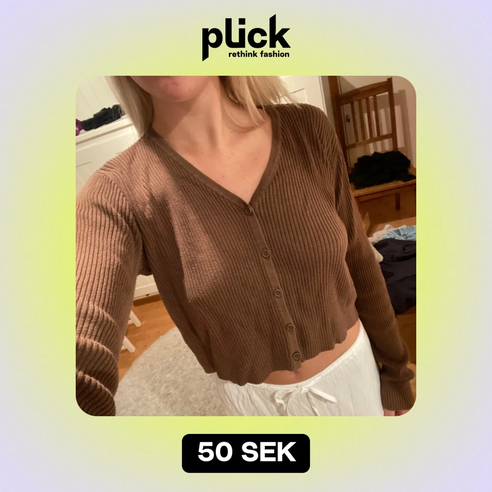 Säljer en superfin brun ribbad kofta med knappar framtill. Den är croppad och har långa ärmar, perfekt för en avslappnad stil. Passar bra till både vardag och mysiga hemmakvällar. 🧡Köpt på Brandy Melville