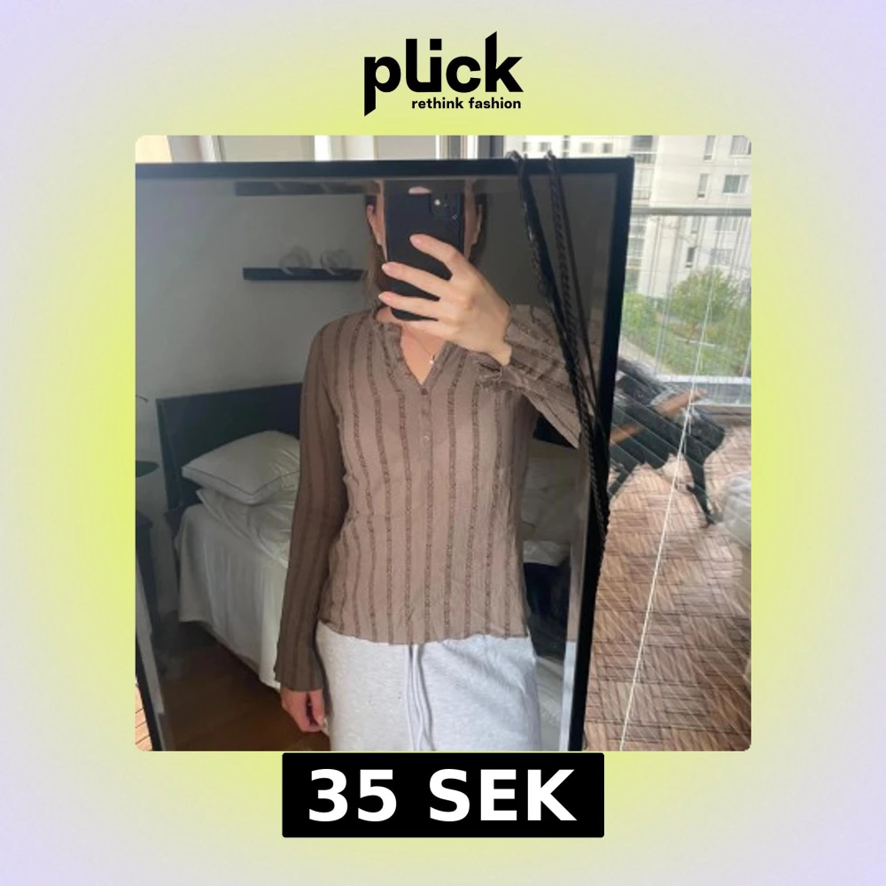 Säljer en brun långärmad topp med ribbat, vertikalt mönster och v-ringning med knappar framtill. Tunt och stretchigt material som sitter snyggt på kroppen. Perfekt att styla med jeans eller kjol för en chill look.