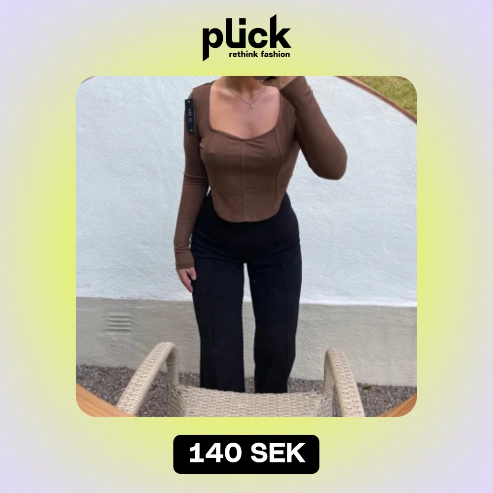 Säljer en snygg brun ribbad topp från NA-KD. Den har en tight passform och långa ärmar, perfekt för höst och vår. Toppen är croppad och har en stilren design med en fyrkantig halsringning. Superfin att matcha med både jeans och kjol!