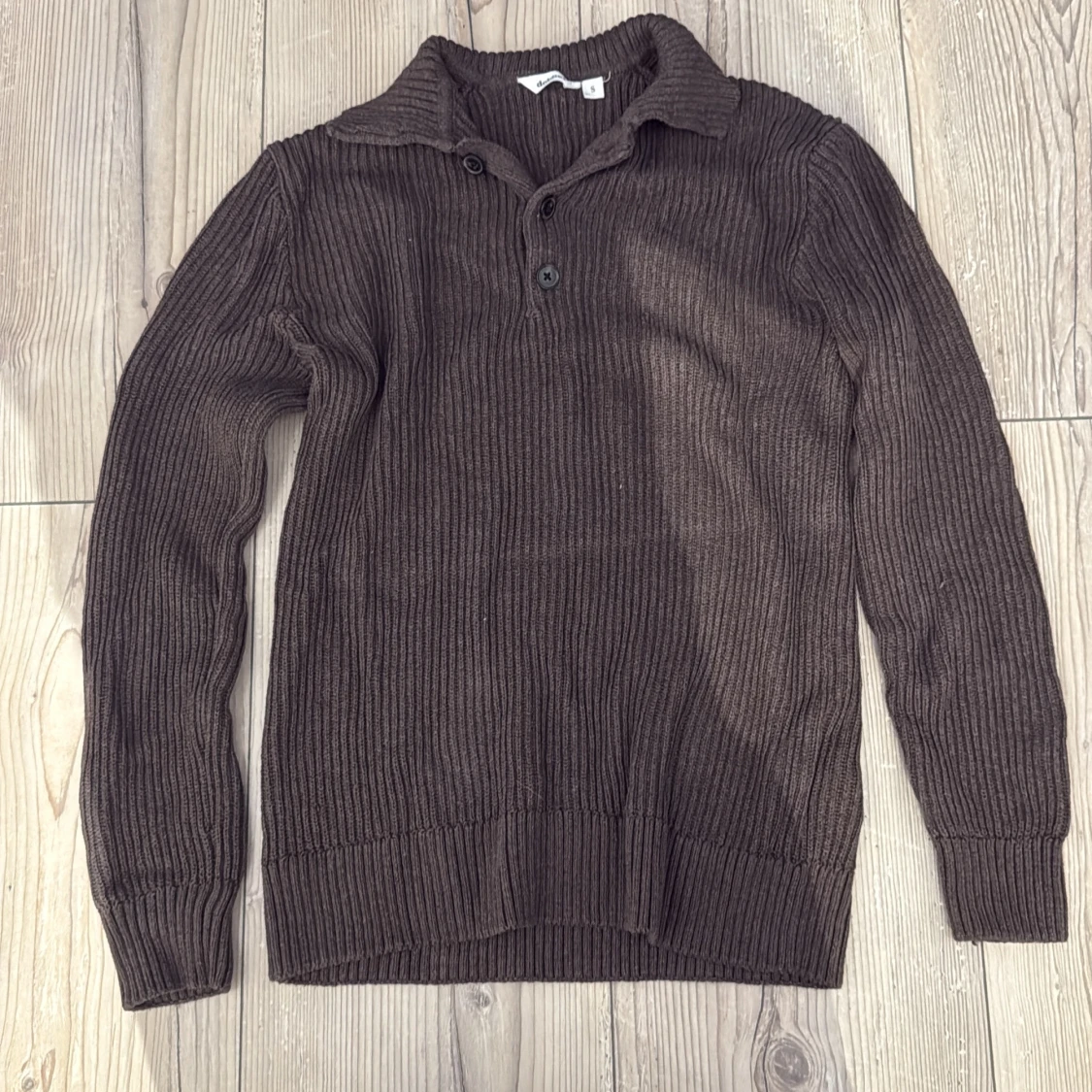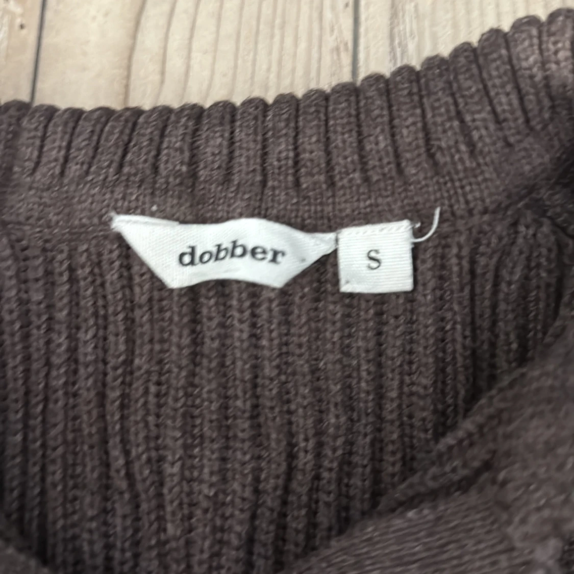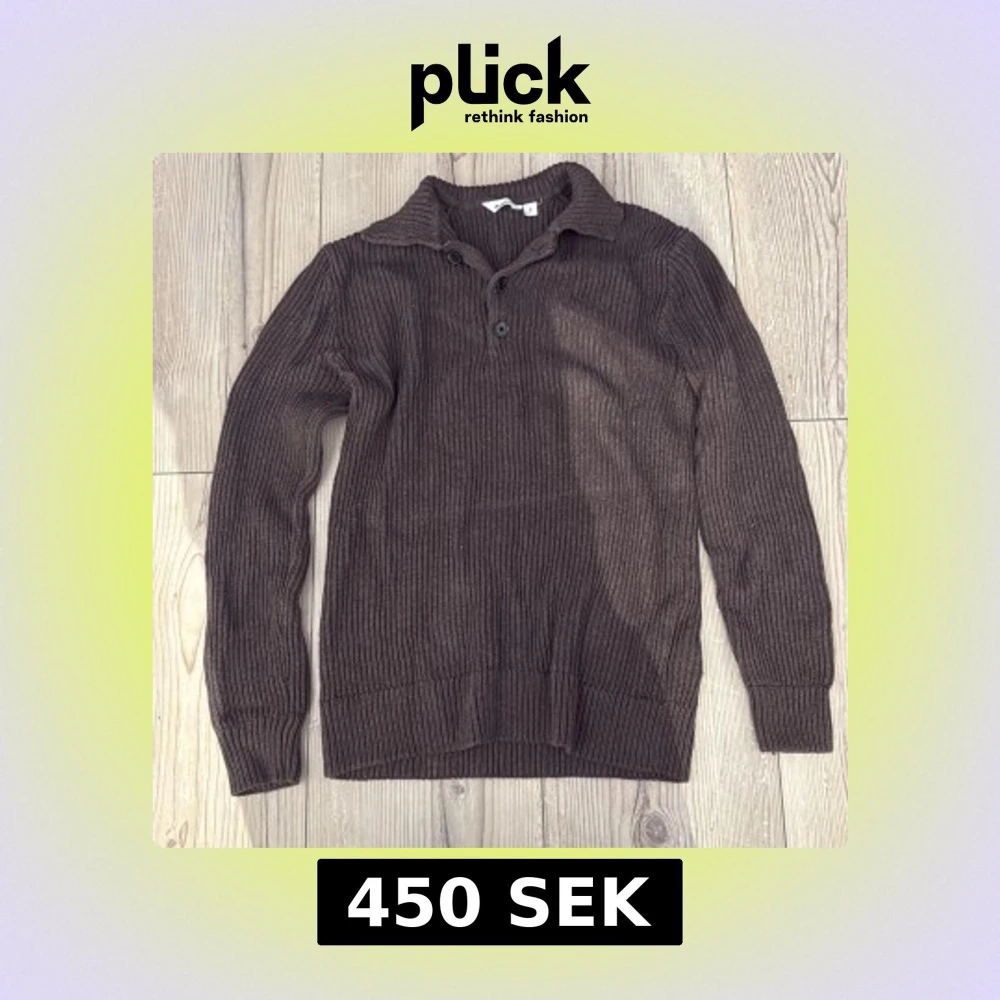 Mysig brun ribbstickad tröja från Dobber med krage och två knappar vid halsen. Långärmad och i klassisk modell som passar perfekt till jeans eller kjol. Tröjan har en skön avslappnad och är tillverkad i stickat material. Använd en gång köptes för 800