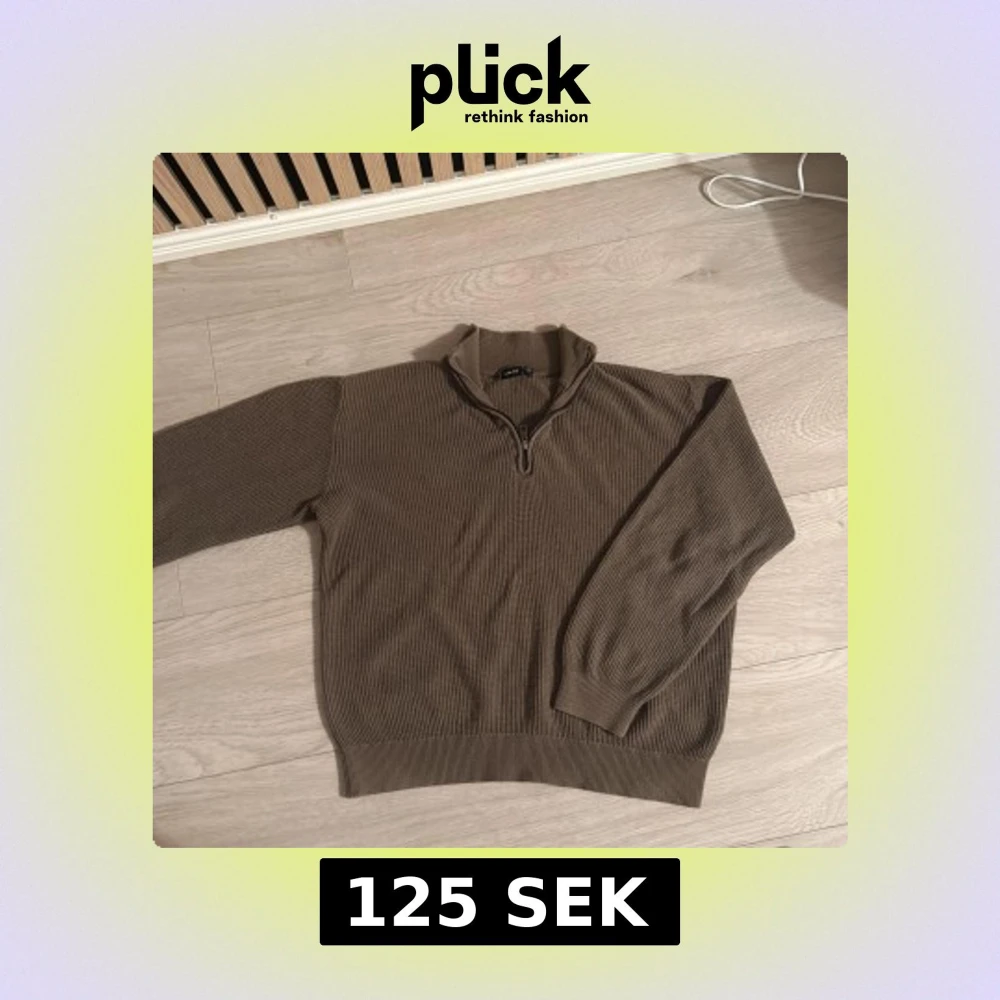 Snygg brun stickad tröja i storlek XS. Tröjan har en ribbad struktur och en praktisk half zip-dragkedja vid kragen. Perfekt för lager-på-lager och chill stil. Långärmad och med breda muddar vid ärmslut och nederkant.