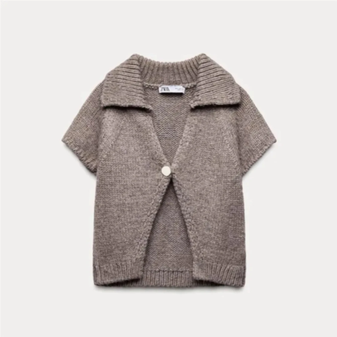 Säljer en brun stickad kofta från Zara med korta ärmar och bred krage. Koftan har en knapp framtill och ribbade detaljer vid krage, ärmslut och nederkant. Perfekt för lager-på-lager och chill stil.