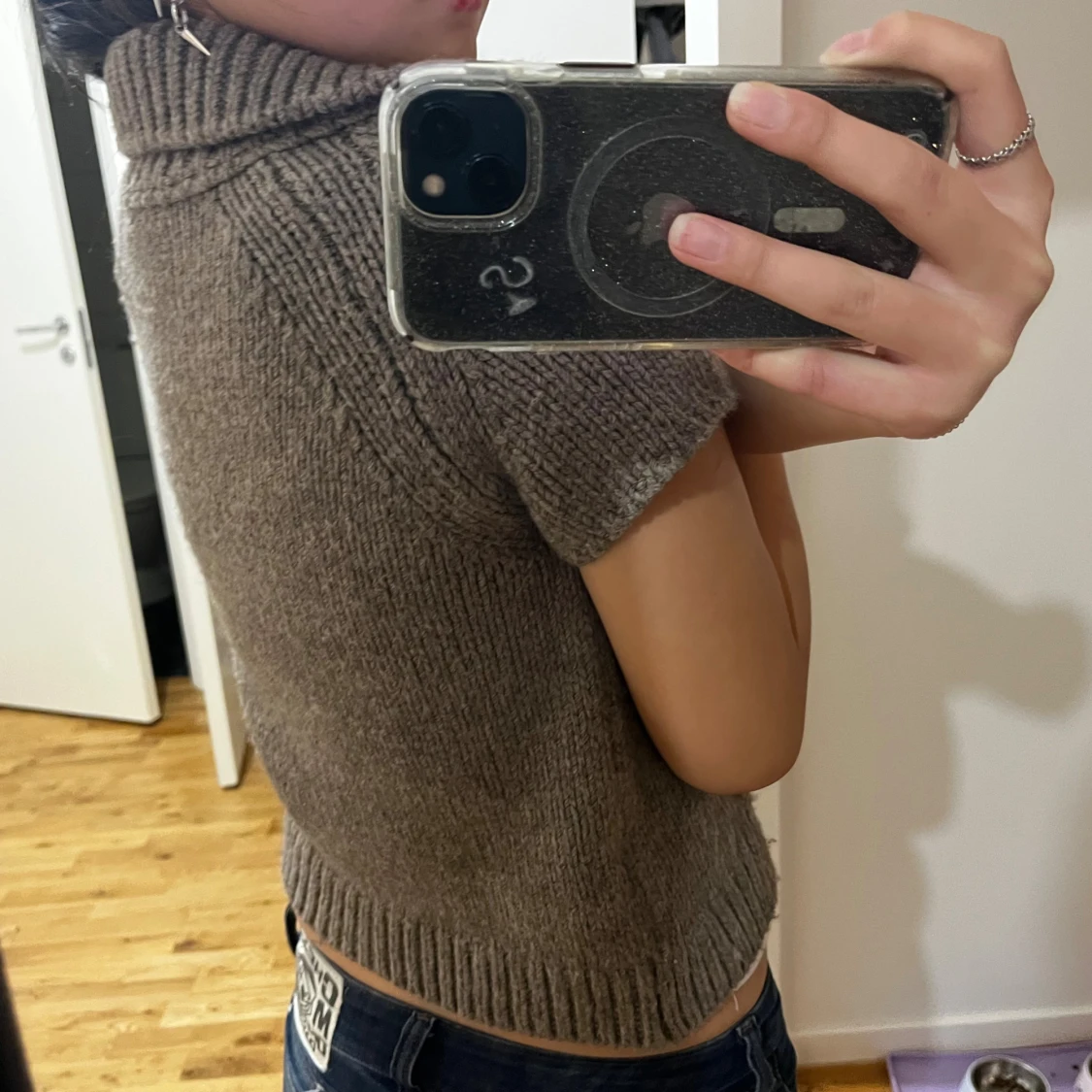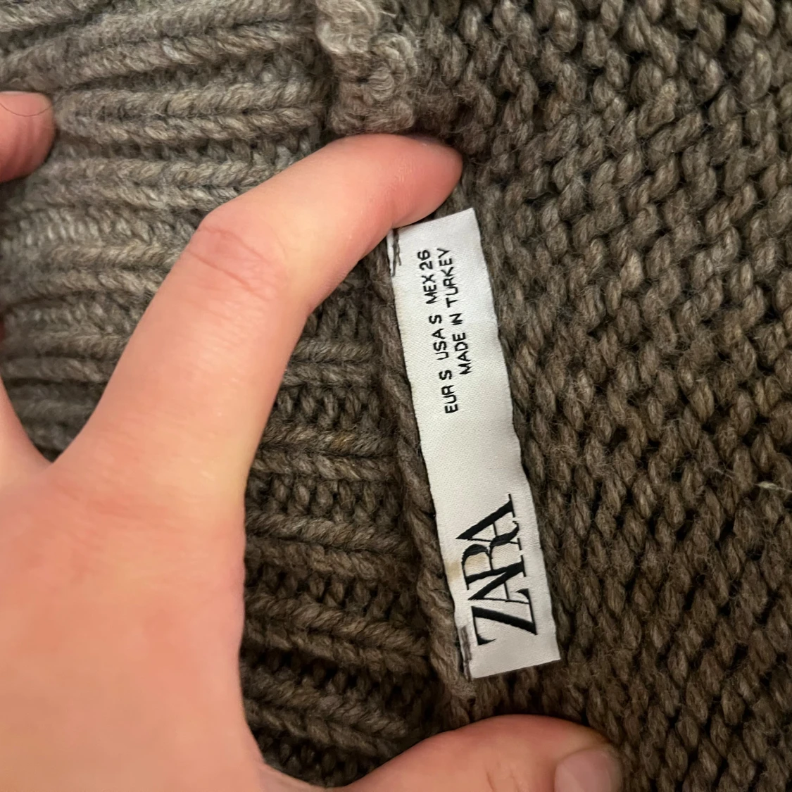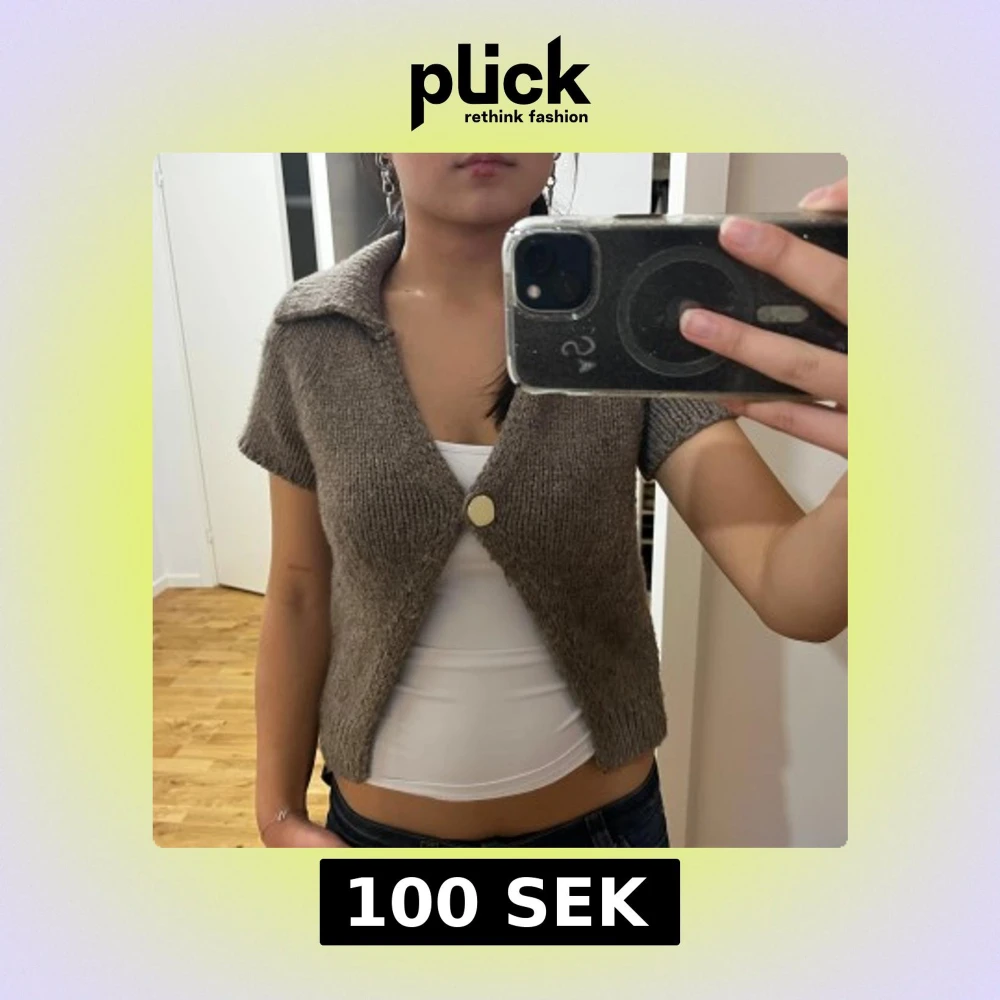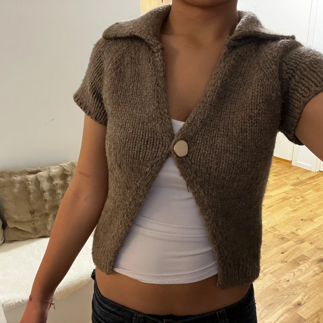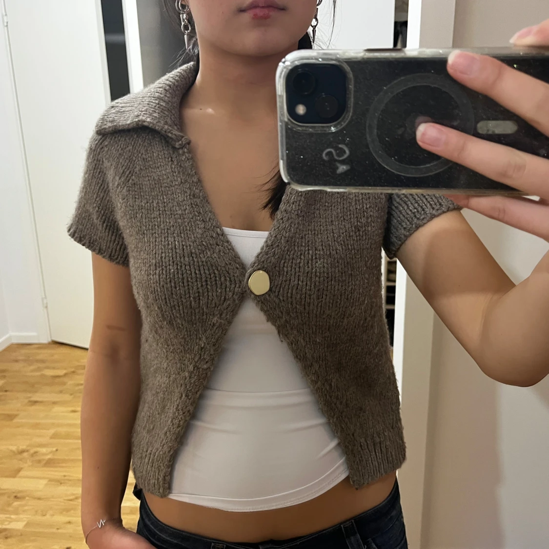 Kortärmad brun stickad kofta från Zara med stor krage och en snygg guldig knapp framtill. Modellen är croppad och har en relaxed fit som passar perfekt till jeans eller kjol. Supermysig och trendig för lager-på-lager-stil.
