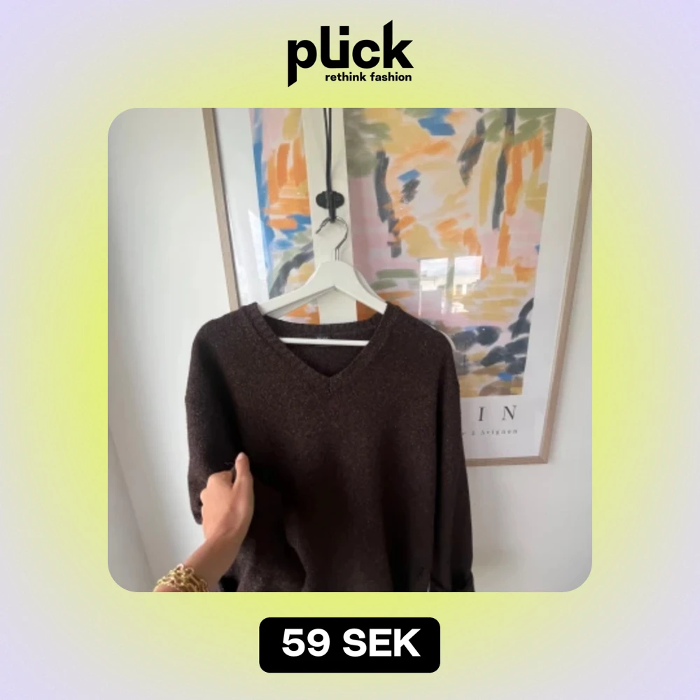 Säljer en mysig brun stickad tröja med v-ringning. Tröjan har långa ärmar och en normal passform. Perfekt för höst och vinter!