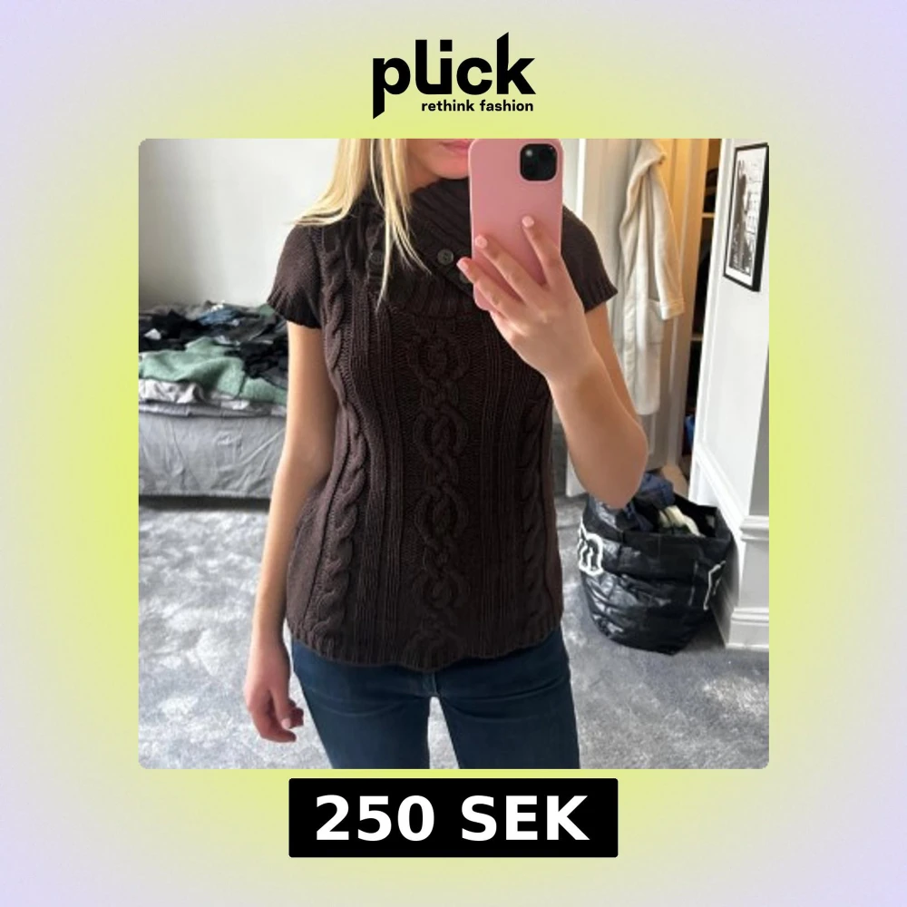 Säljer en brun stickad tröja med korta ärmar och en hög krage dekorerad med knappar. Tröjan har ett snyggt flätmönster som ger en stilren look. Perfekt för kyligare dagar!