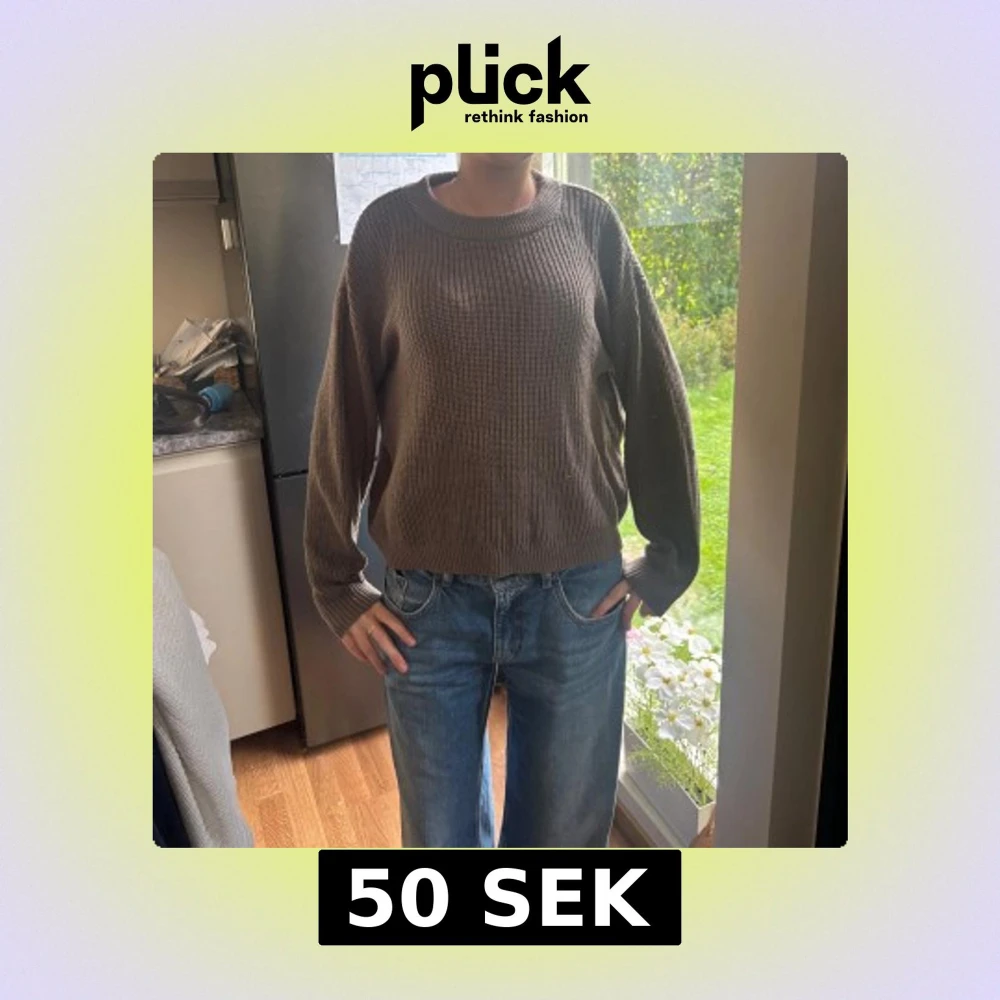 Säljer en brun stickad tröja med rund hals och avslappnad passform. Tröjan har långa ärmar och ribbade muddar vid ärmslut och nederkant. Perfekt för lager-på-lager och chill dagar.