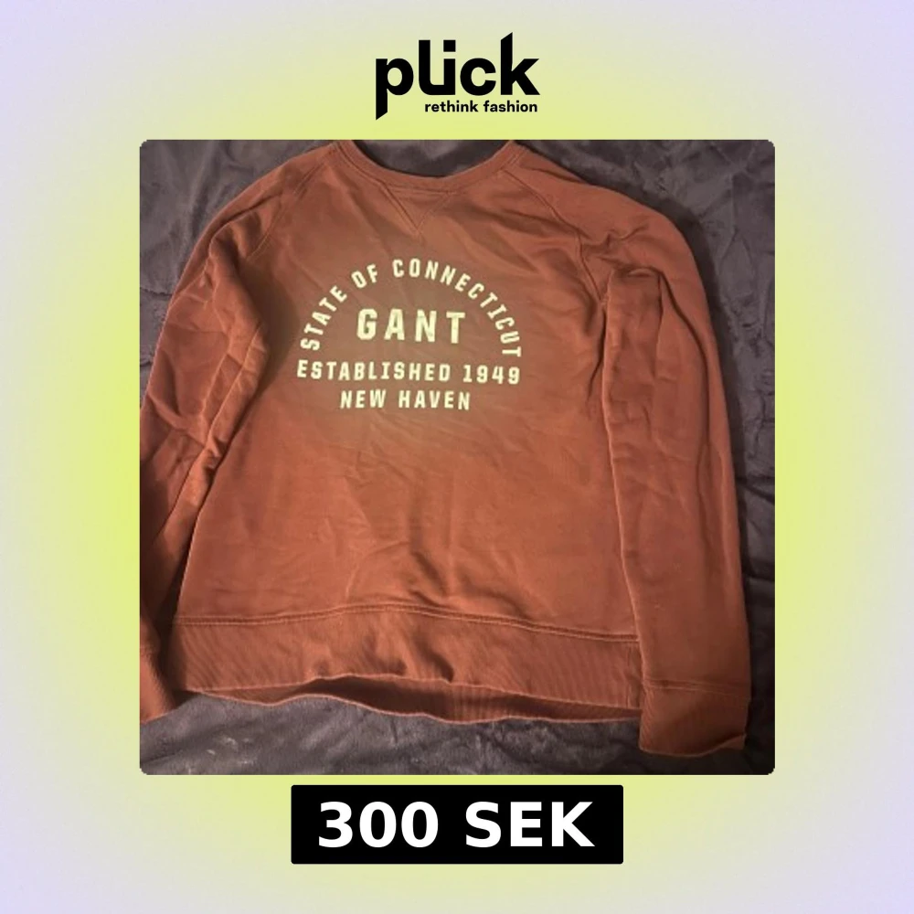 Säljer en brun sweatshirt från GANT med stort vitt tryck på bröstet: 'State of Connecticut, GANT, Established 1949, New Haven'. Tröjan har rund hals, ribbade muddar och är långärmad. Perfekt för dig som gillar klassisk college-stil.