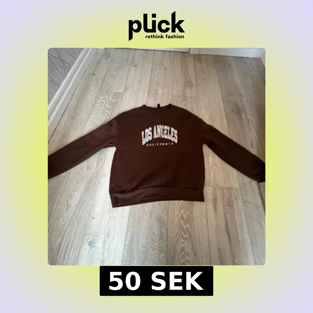 Säljer en brun sweatshirt med texten 'Los Angeles California' i vitt tryck på framsidan. Tröjan har långa ärmar och en klassisk rund halsringning. Perfekt för en avslappnad stil.