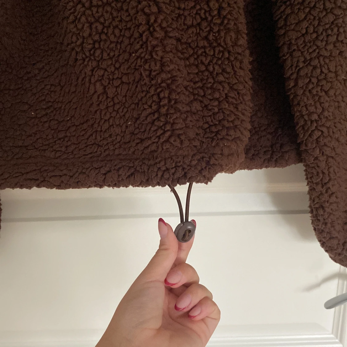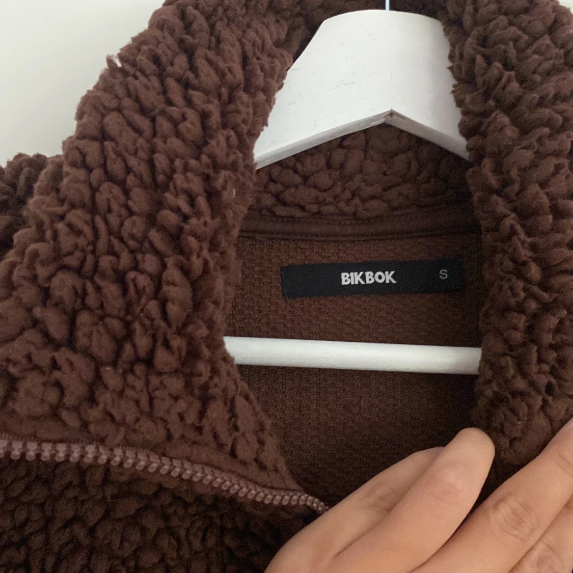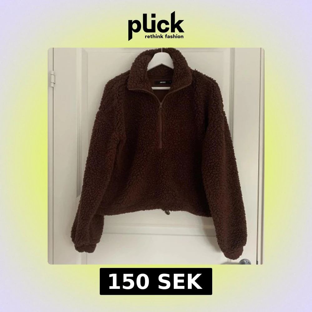 Mysig brun teddytröja från BikBok i storlek S. Tröjan har halv dragkedja, hög krage och snörning nertill för att justera passformen. Perfekt nu inför hösten och har en loose fit med långa ärmar.