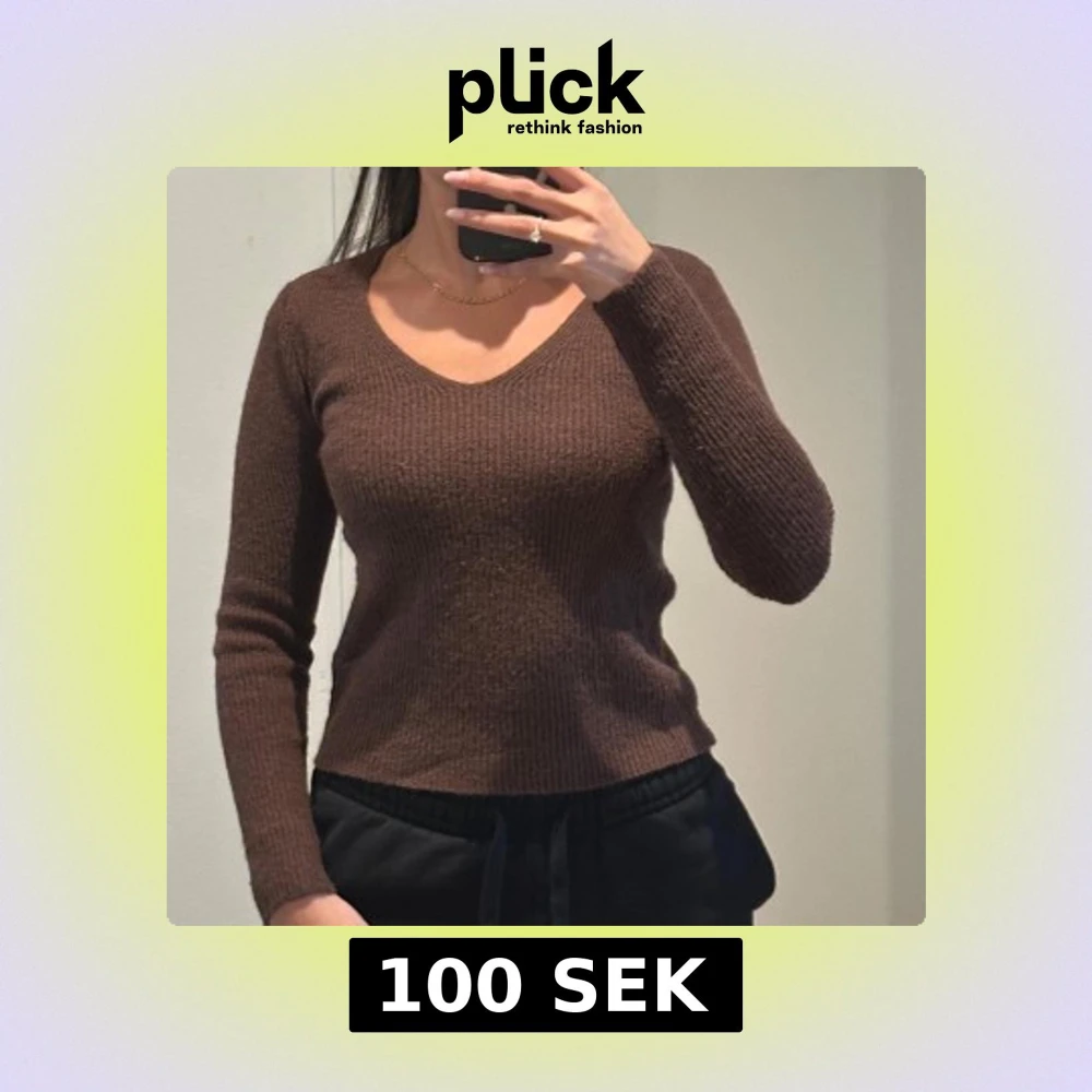 Säljer en snygg brun tröja med v-ringning. Tröjan har långa ärmar och en tight passform som framhäver figuren. Perfekt för en stilren look.