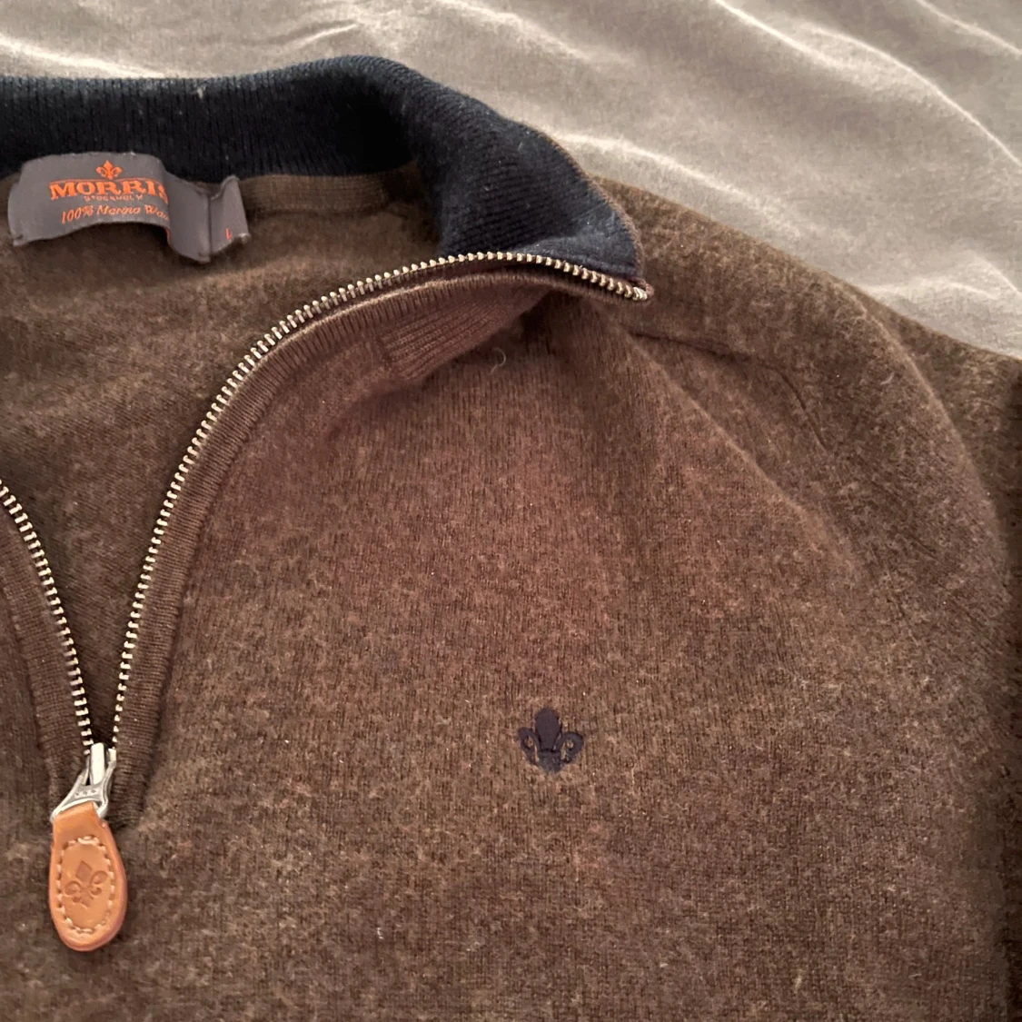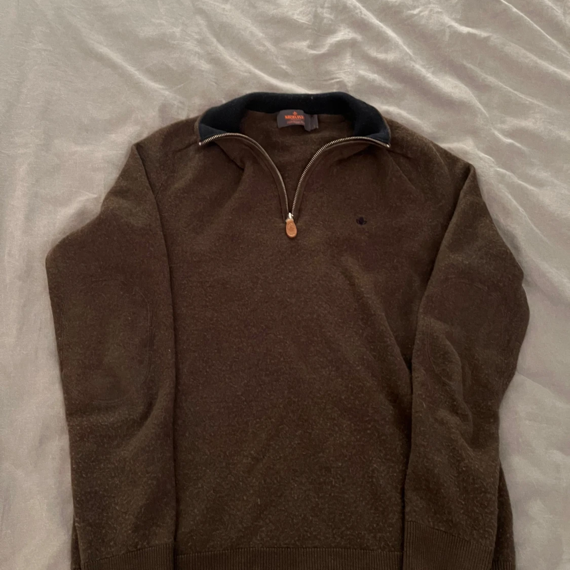 Säljer en brun tröja från Morel med dragkedja och mörkblå krage. Tröjan har ett litet broderat emblem på bröstet och är tillverkad i 100% ren ull. Perfekt för kyliga dagar!