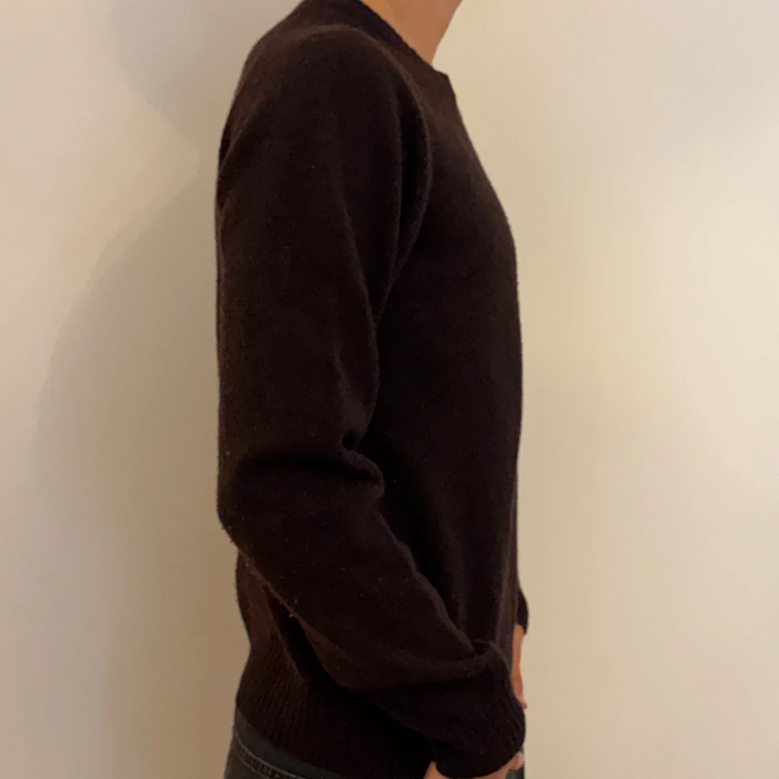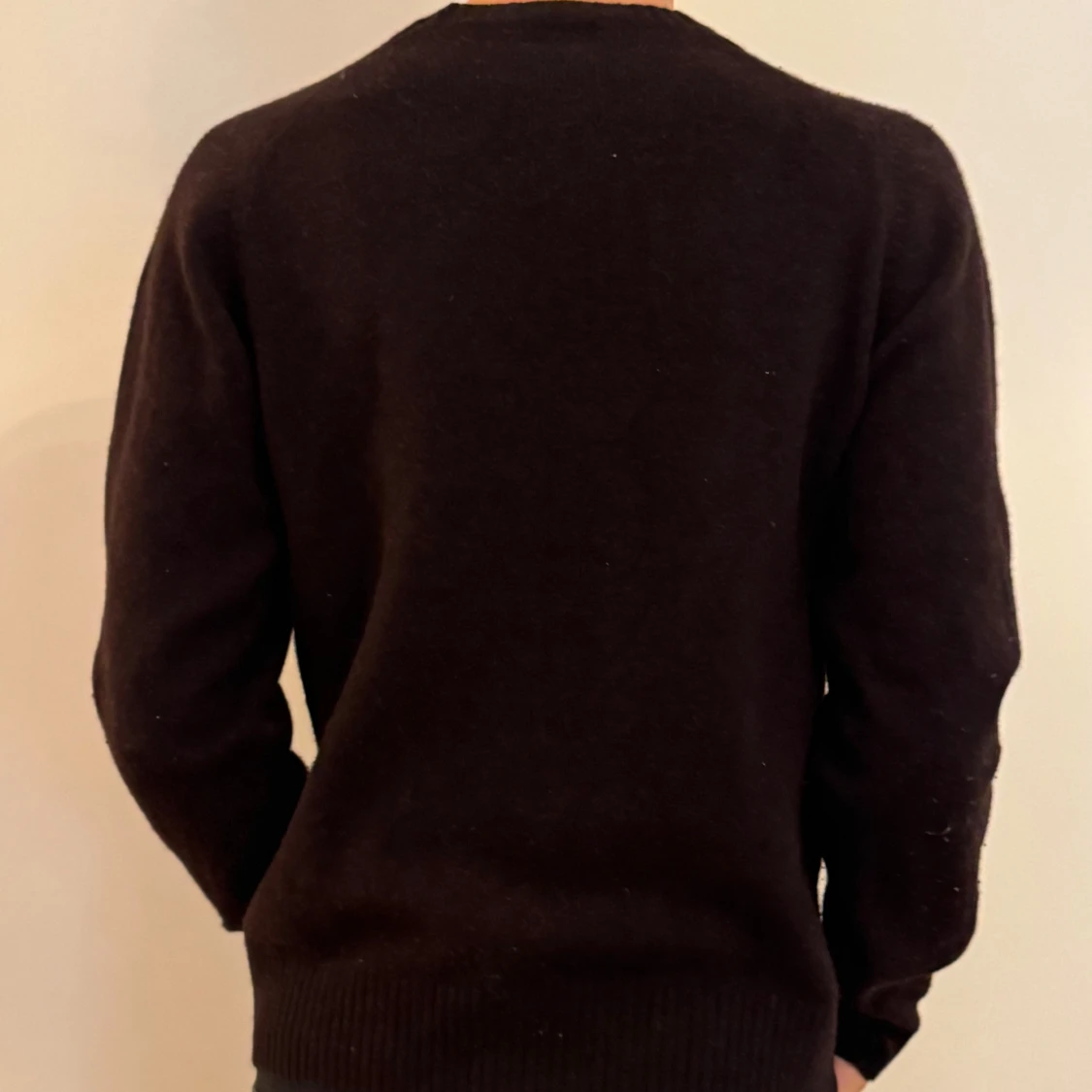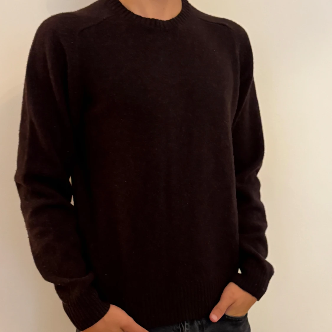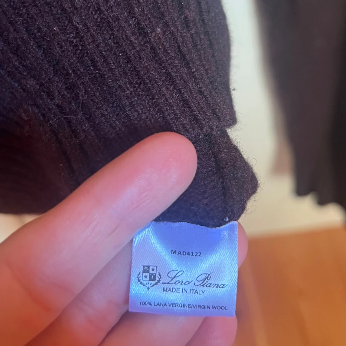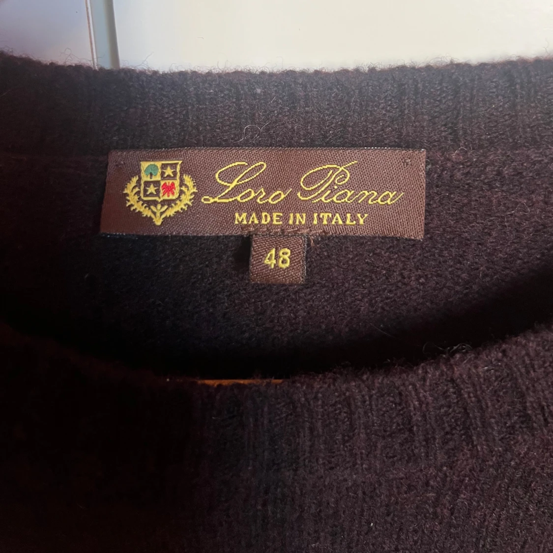 Självklart äkta! Klassisk mörkbrun stickad tröja från Loro Piana i 100% virgin wool. Tröjan har rund halsringning, ribbade muddar och lång ärm. Perfekt för dig som gillar stilren och lyxig design med italiensk känsla.