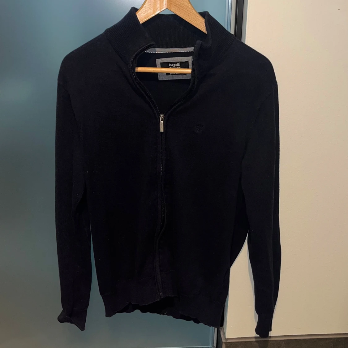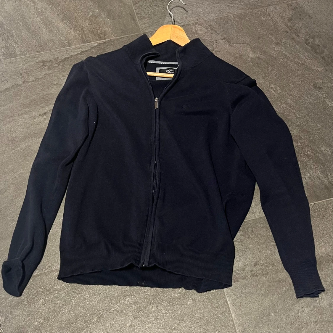 Säljer en stilren mörkblå kofta från Bugatti i mjukaste bomull. Koftan har dragkedja framtill, ribbade muddar och hög krage. Perfekt att slänga på sig när det är lite kyligt ute. Enkel och klassisk design som funkar till det mesta.