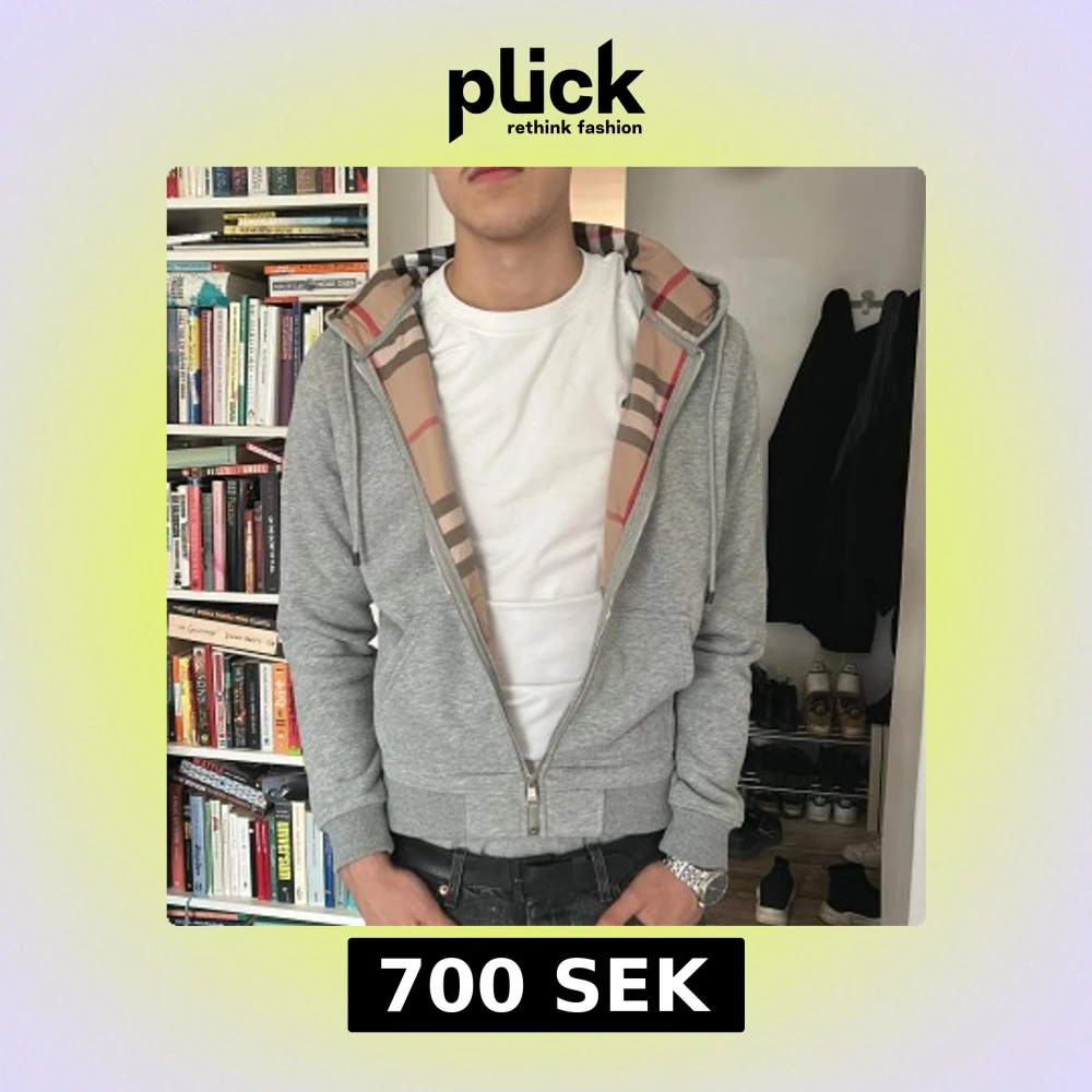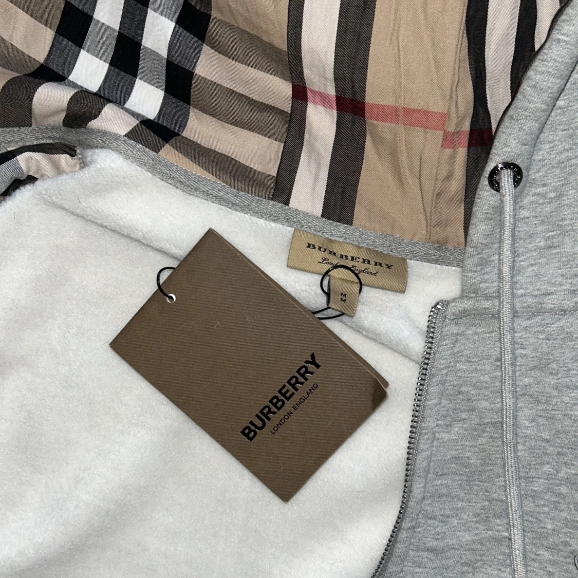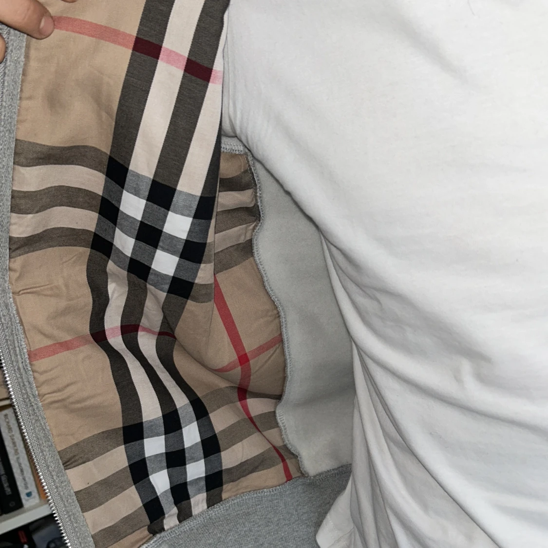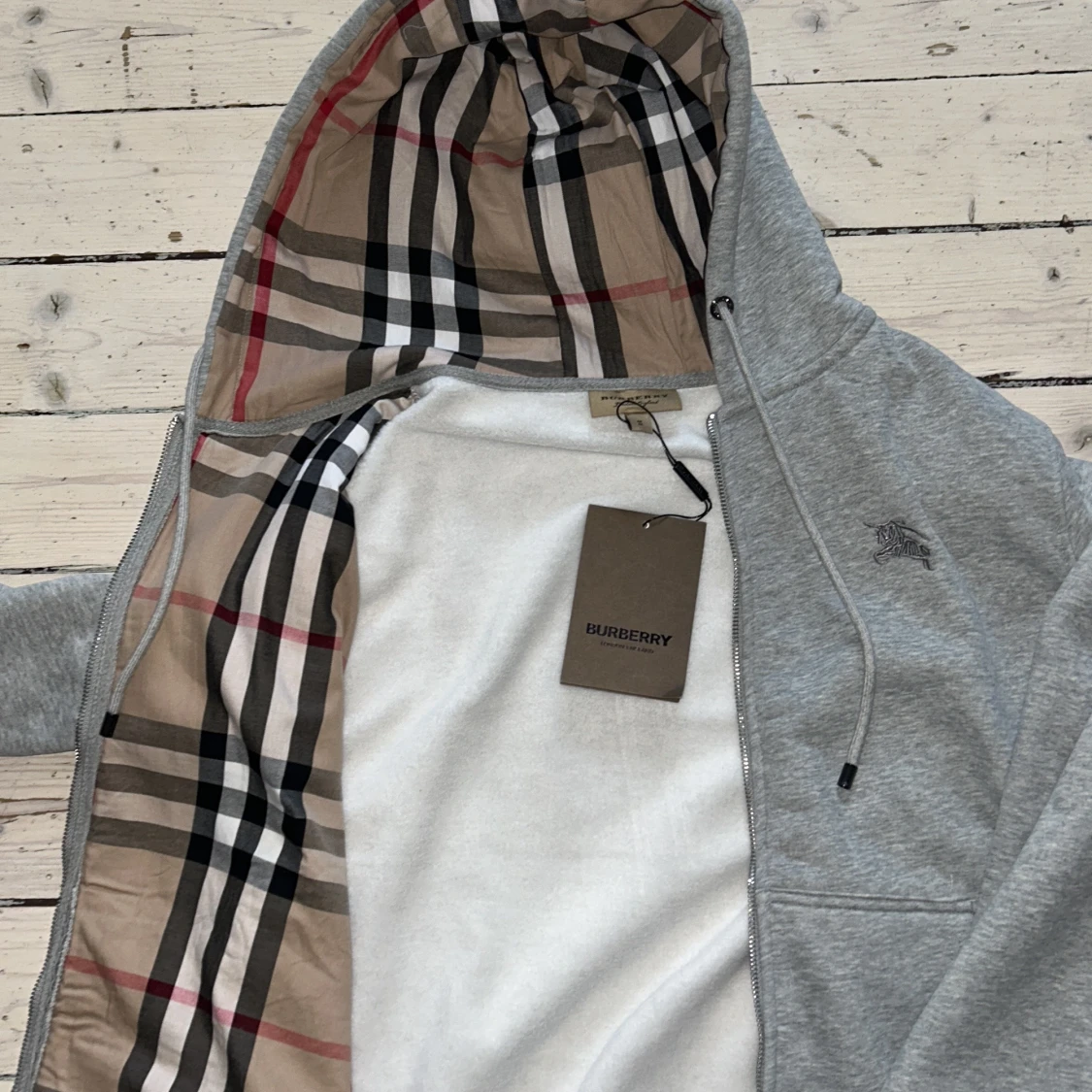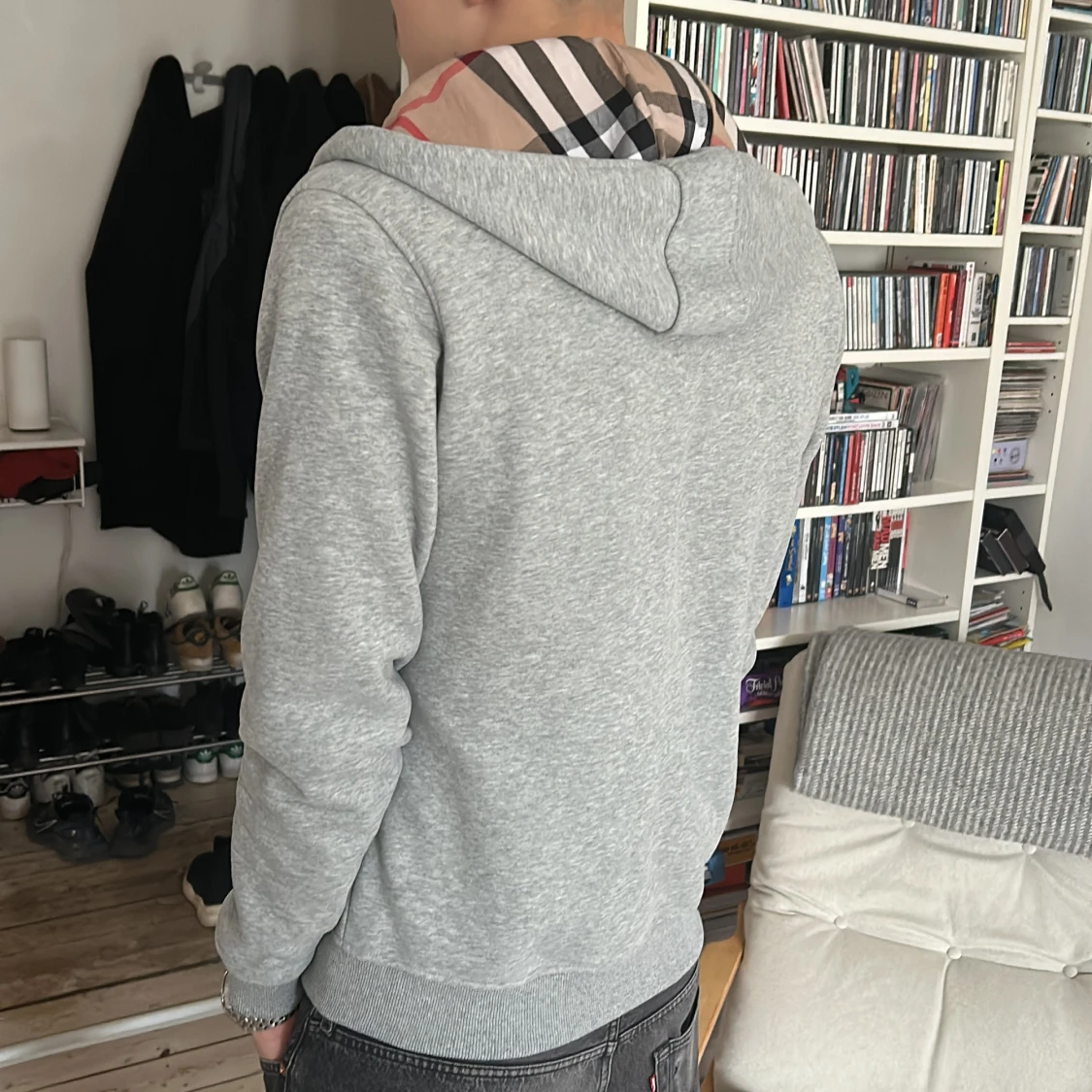 Säljer en stilren grå hoodie från Burberry med det klassiska rutiga mönstret på insidan av huvan. Den har dragkedja framtill och är tillverkad i mjukt material för extra komfort. Perfekt för en avslappnad look.