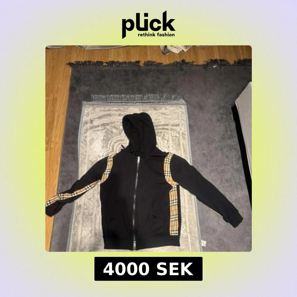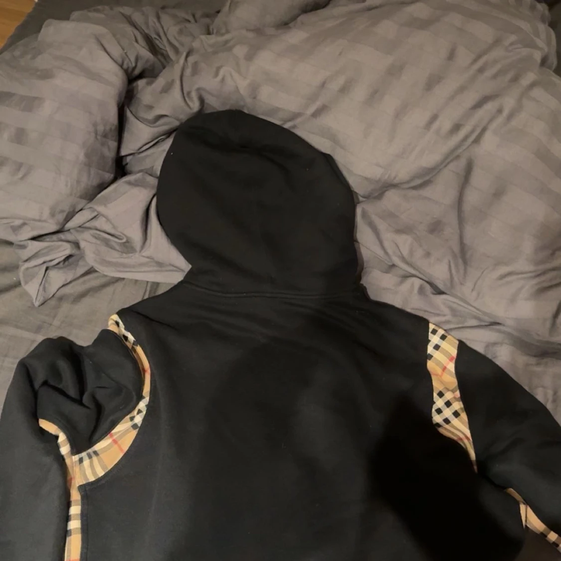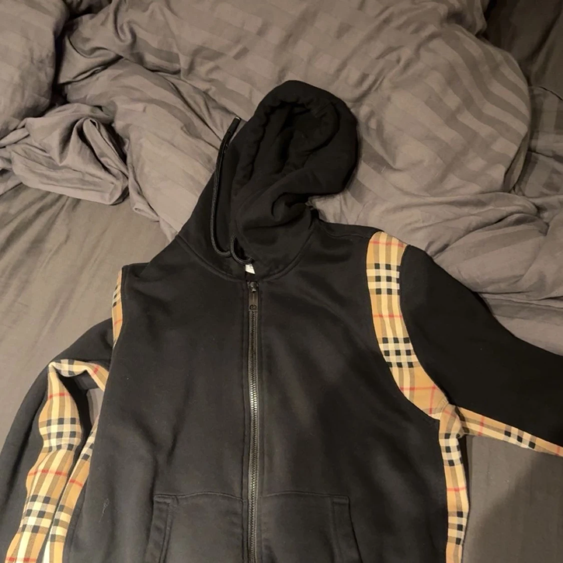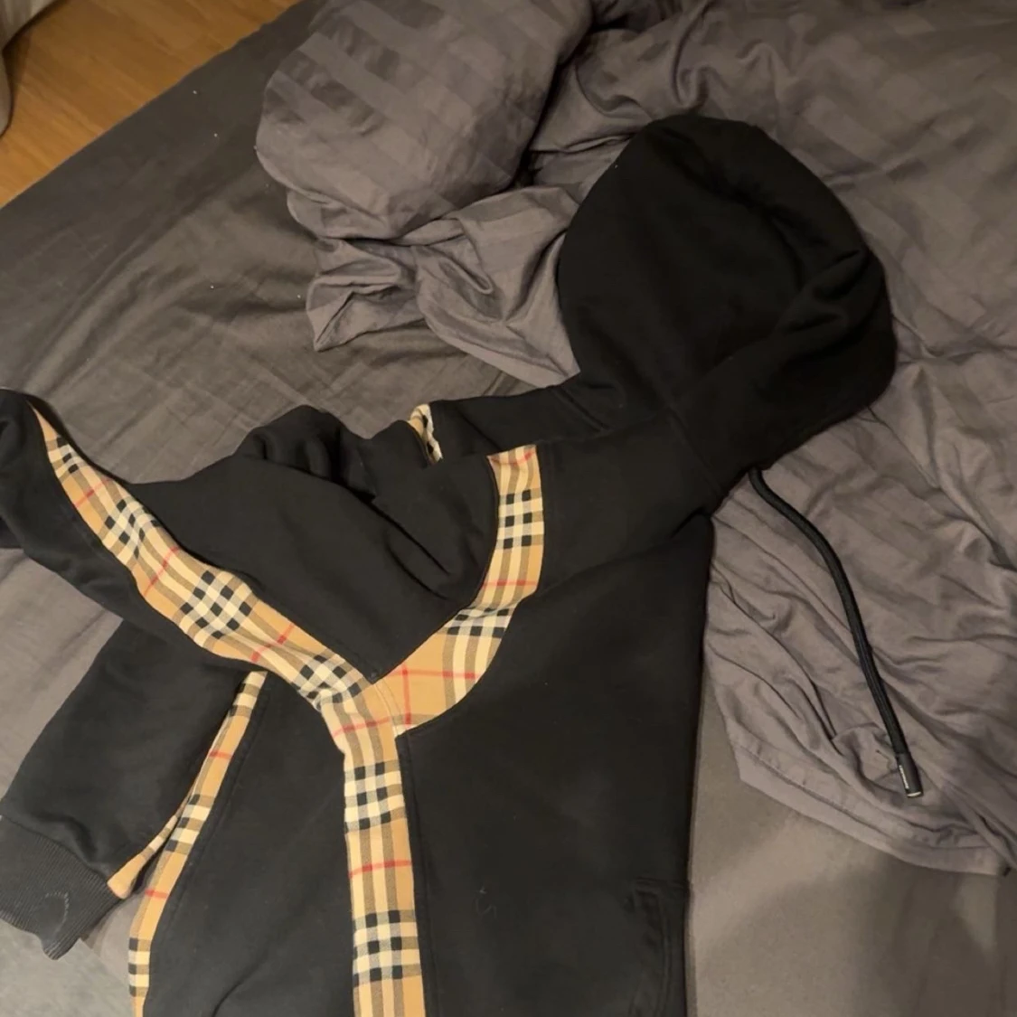 Säljer en svart hoodie med dragkedja och klassiska rutiga detaljer längs ärmarna och sidorna. Perfekt för en stilren och bekväm look. Hoodien har en justerbar huva och fickor framtill.