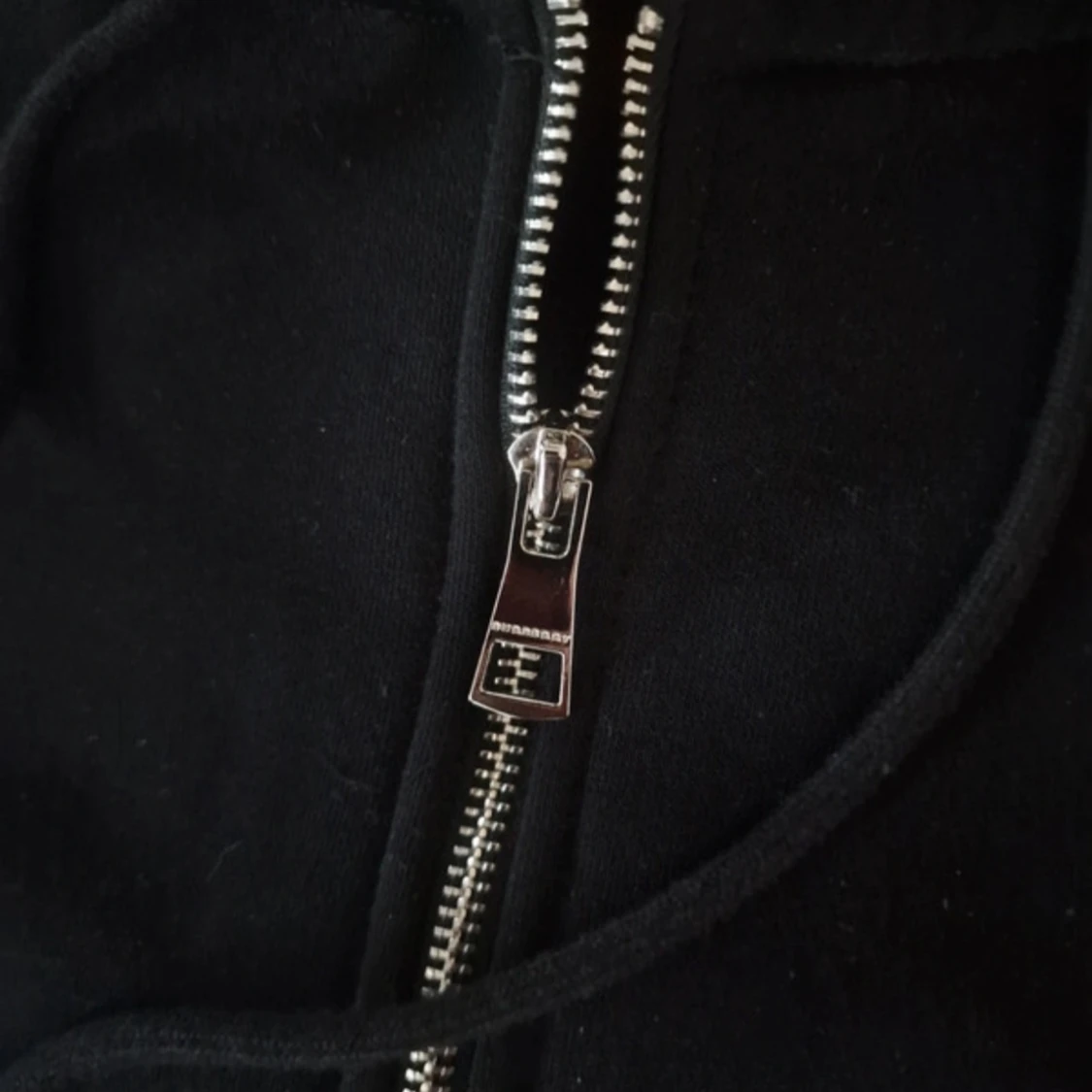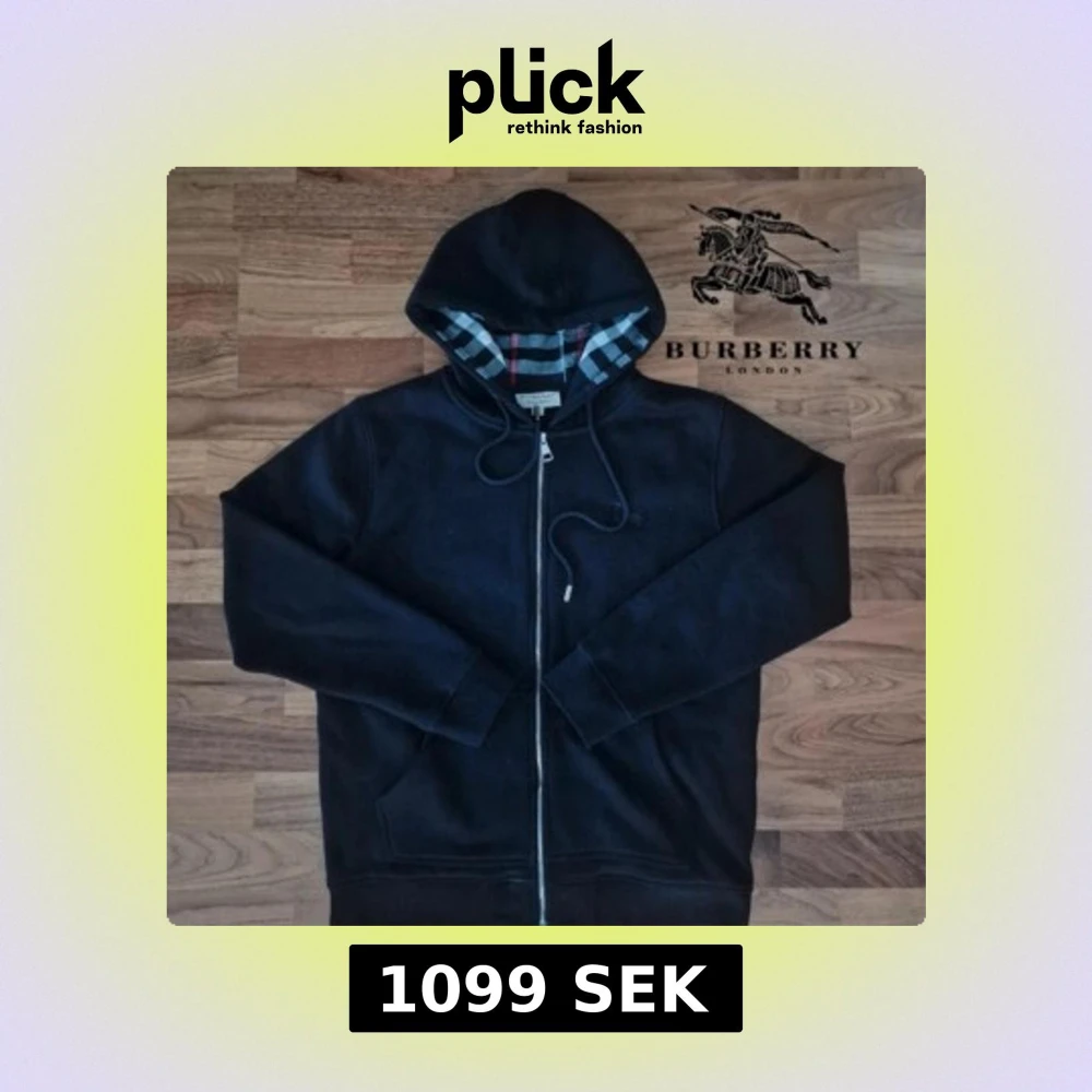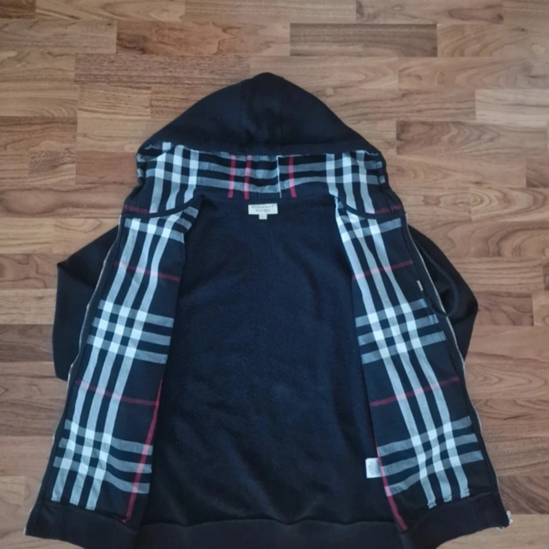 Snygg svart hoodie från Burberry med dragkedja och klassiskt rutigt mönster på insidan av huvan. Den har långa ärmar och en broderad logga på bröstet. Perfekt för en stilren look.