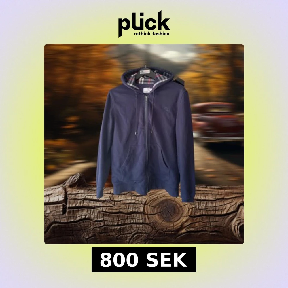Säljer en mörkblå hoodie från Burberry med dragkedja och justerbar huva. Insidan av huvan har ett rutigt mönster. Perfekt för en avslappnad stil.