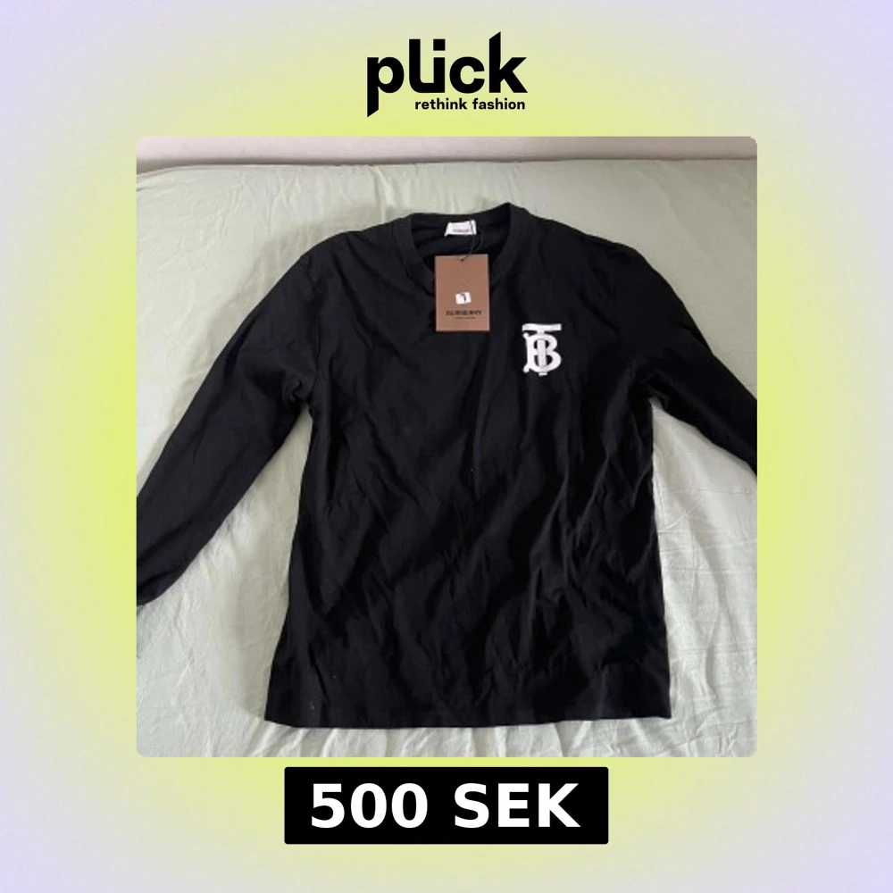 Säljer en stilren svart långärmad tröja från Burberry med vit logotyp på bröstet. Perfekt för en avslappnad men elegant look. Tröjan är i bomull och har en klassisk passform. Passar en M
