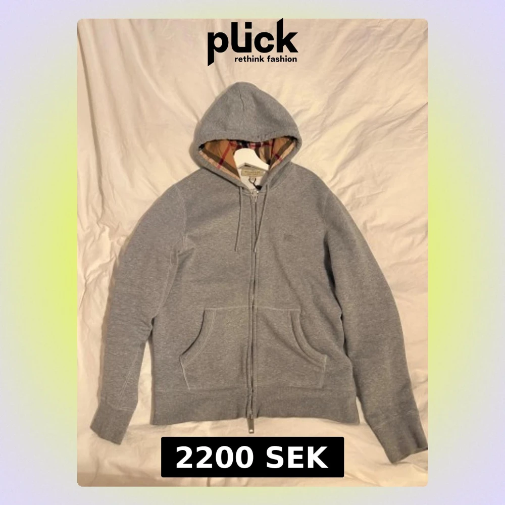 Säljer en grå hoodie från Burberry i storlek M. Tröjan har dragkedja, snörning och klassisk rutig insida på huvan. Tillverkad i mjuk bomull och polyester, med två fickor framtill och ribbade muddar. Perfekt för dig som gillar stilren design med lyxig touch.