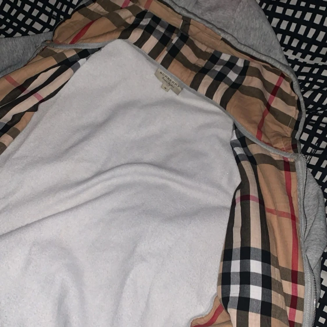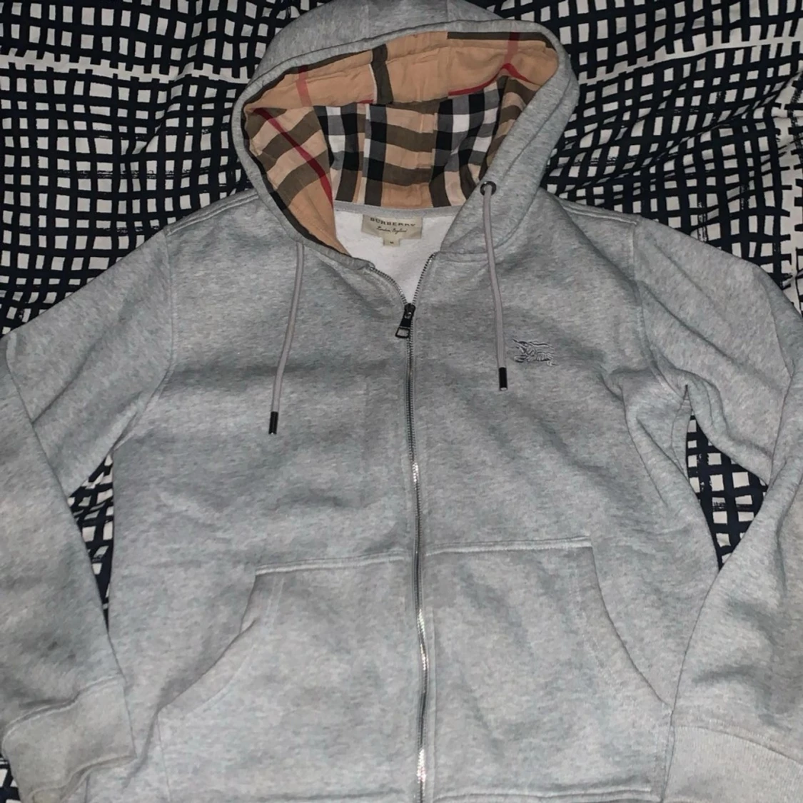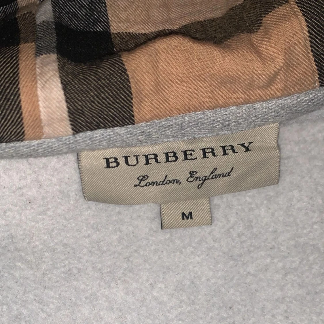 Säljer en stilren grå huvtröja från Burberry med dragkedja och klassiskt rutigt mönster i huvan. Tröjan har långa ärmar och en bekväm passform. Perfekt för en avslappnad look. Storlek M passar S