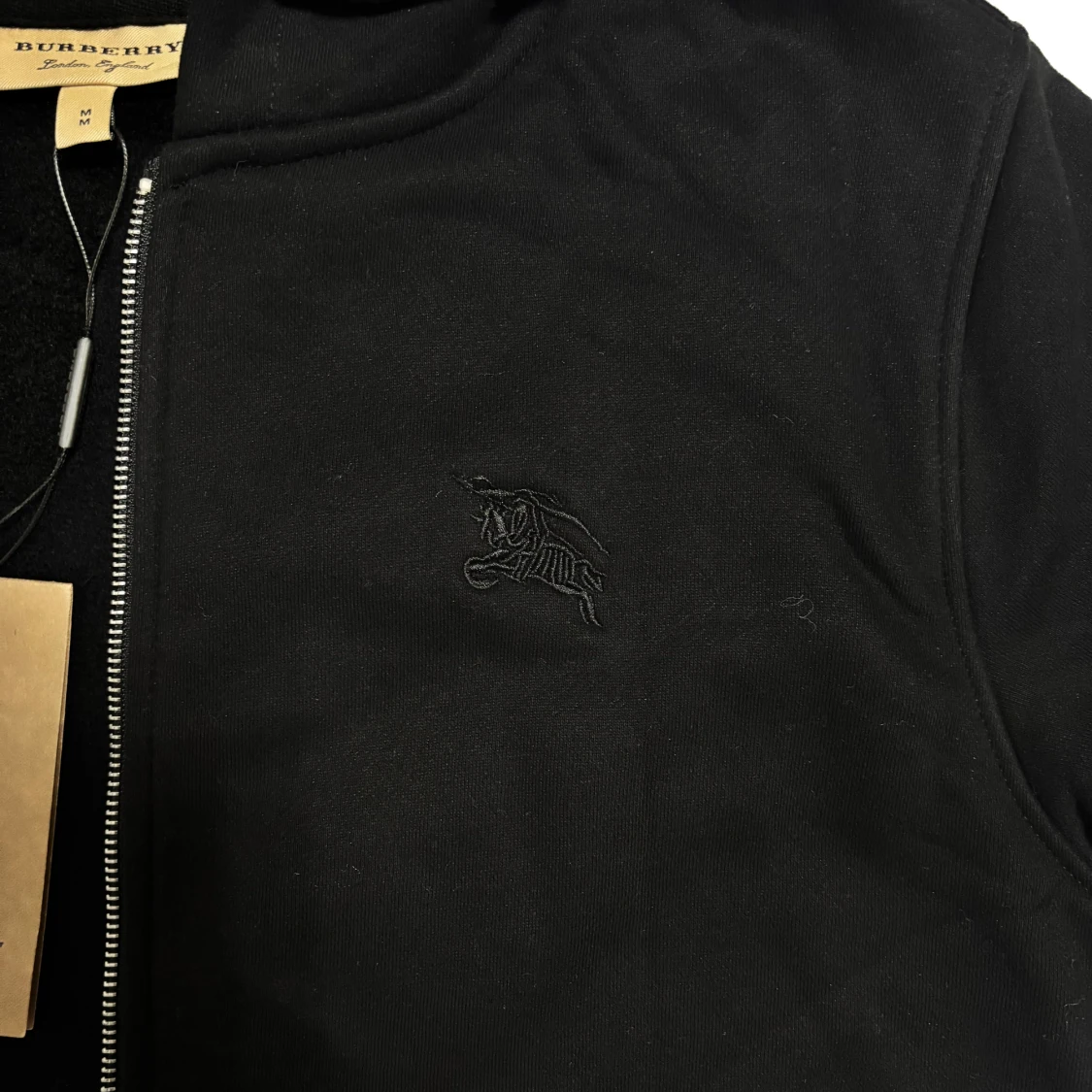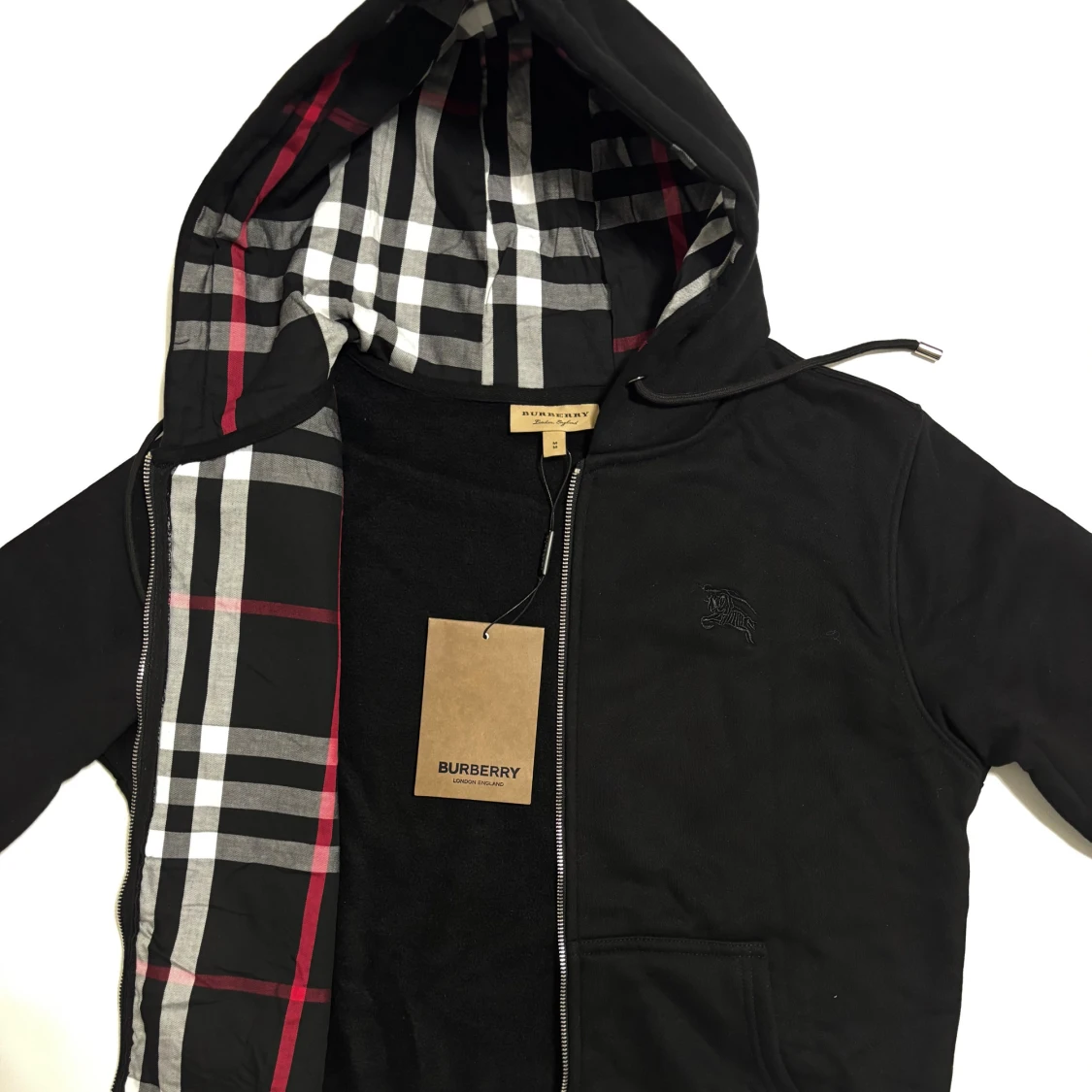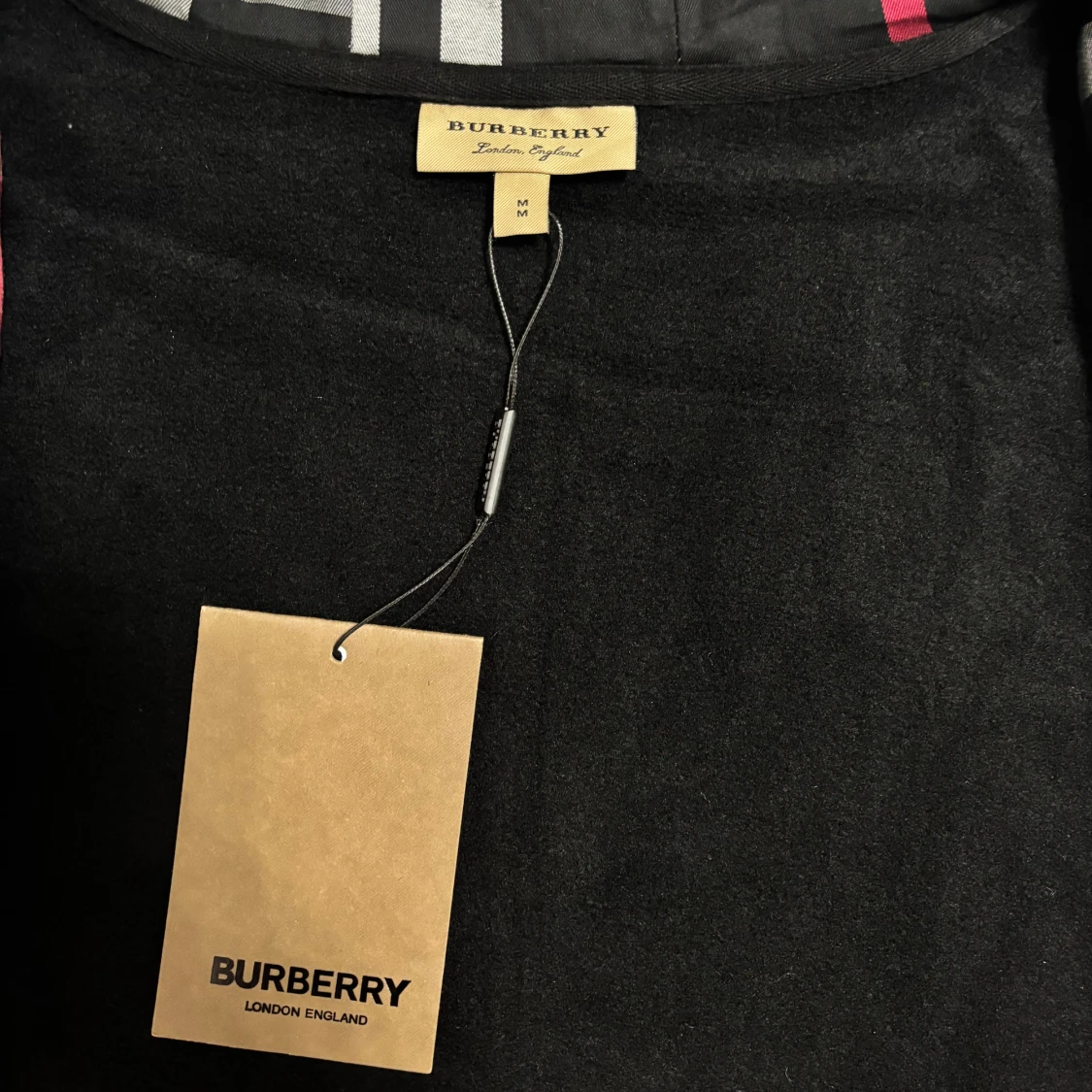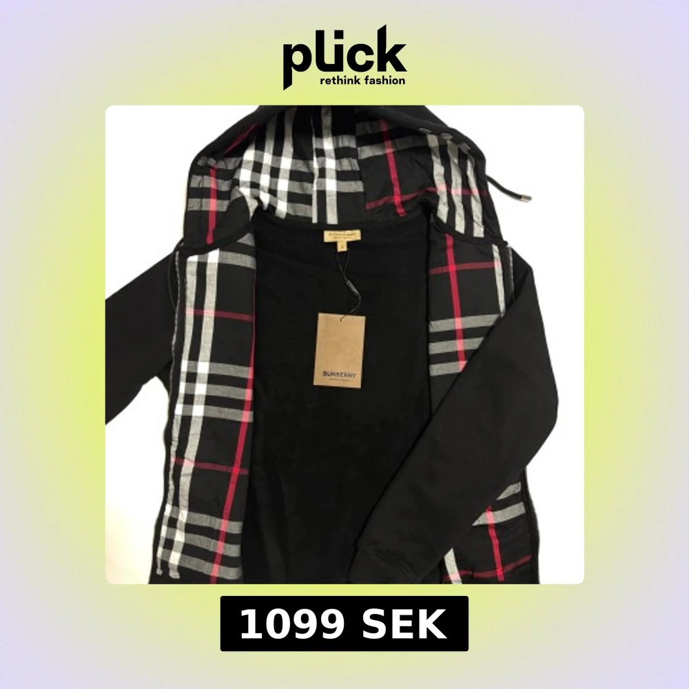 Svart kofta från Burberry 10/10 kvalité med klassiskt rutig insida i svart, vitt och rött. Koftan har huva med dragsko, dragkedja framtill och diskret broderad logga på bröstet. Perfekt för de kommande kyliga dagar. Storleken är M. Skickas inom 24timmar!