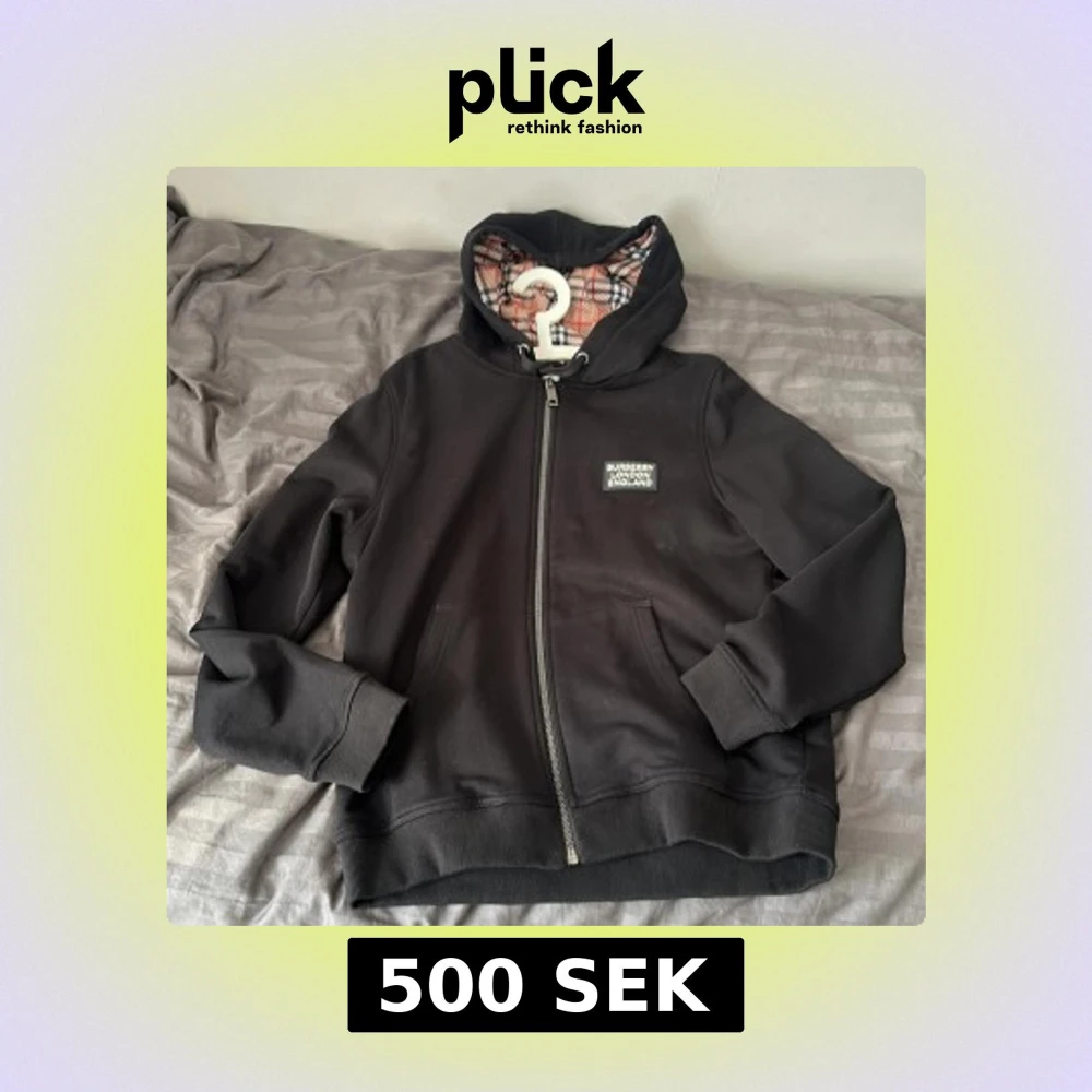 Säljer en svart hoodie från Burberry i storlek L med klassiskt rutig foder i beige, svart och rött. Tröjan har huva, dragkedja framtill och Burberry-logga på bröstet. Perfekt för dig som vill ha en stilren och lyxig streetwear-look. Hoodien är stor och tjock av sig. Perfekt för att hålla värmen under de kommande årstiderna