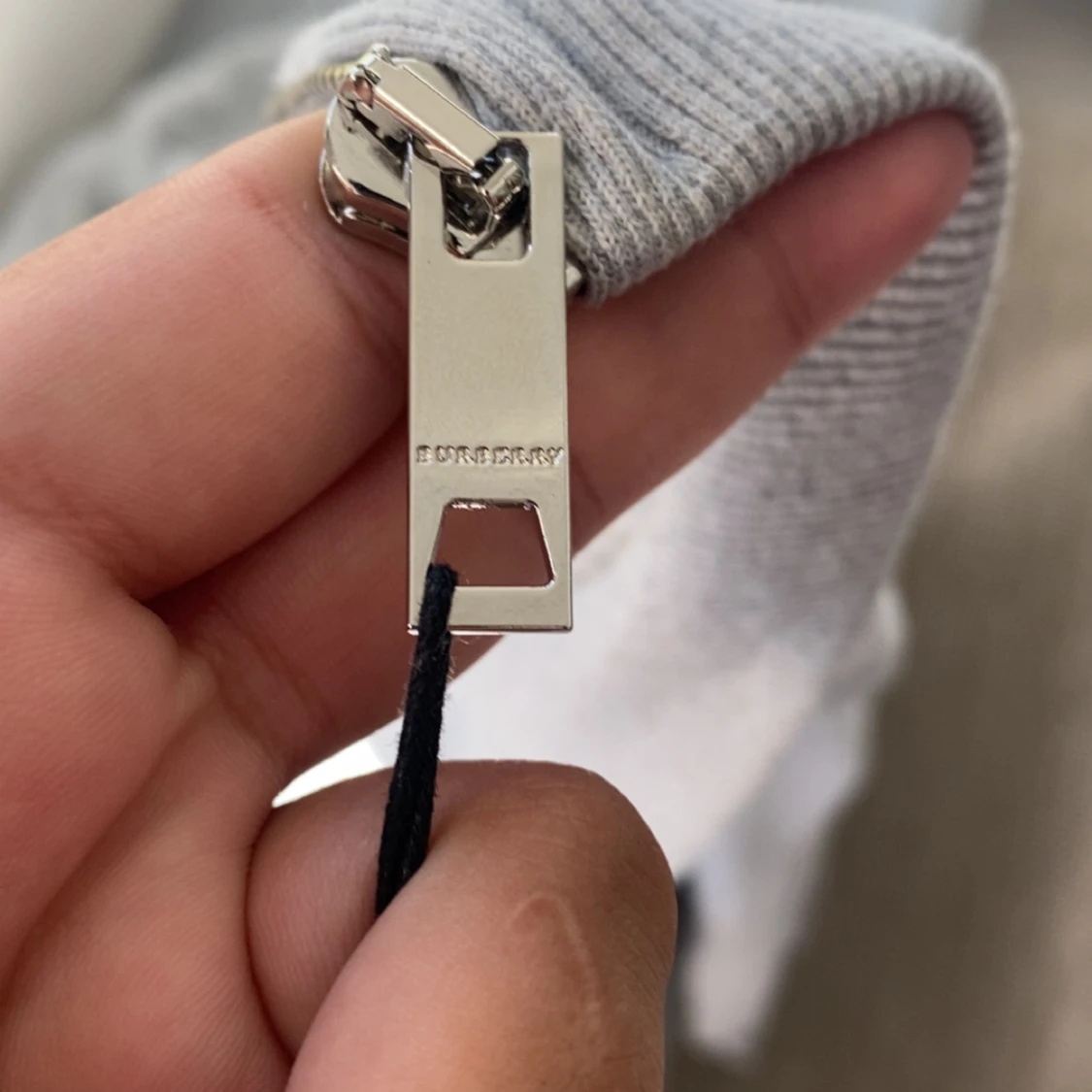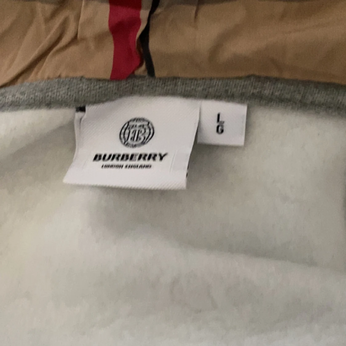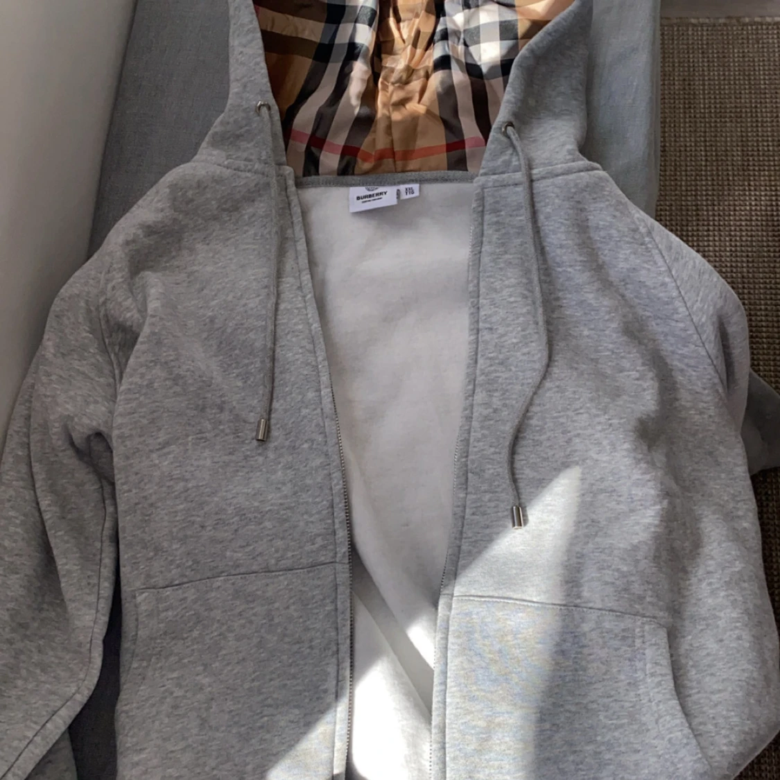 Säljer en grå hoodie från Burberry med klassiskt rutigt foder i huvan. Tröjan har dragkedja, snörning vid huvan och två fickor framtill. Tillverkad i 100% bomull och har snygga metall-detaljer på snöret och dragkedjan. Perfekt för dig som gillar stilren design med lyxig touch.