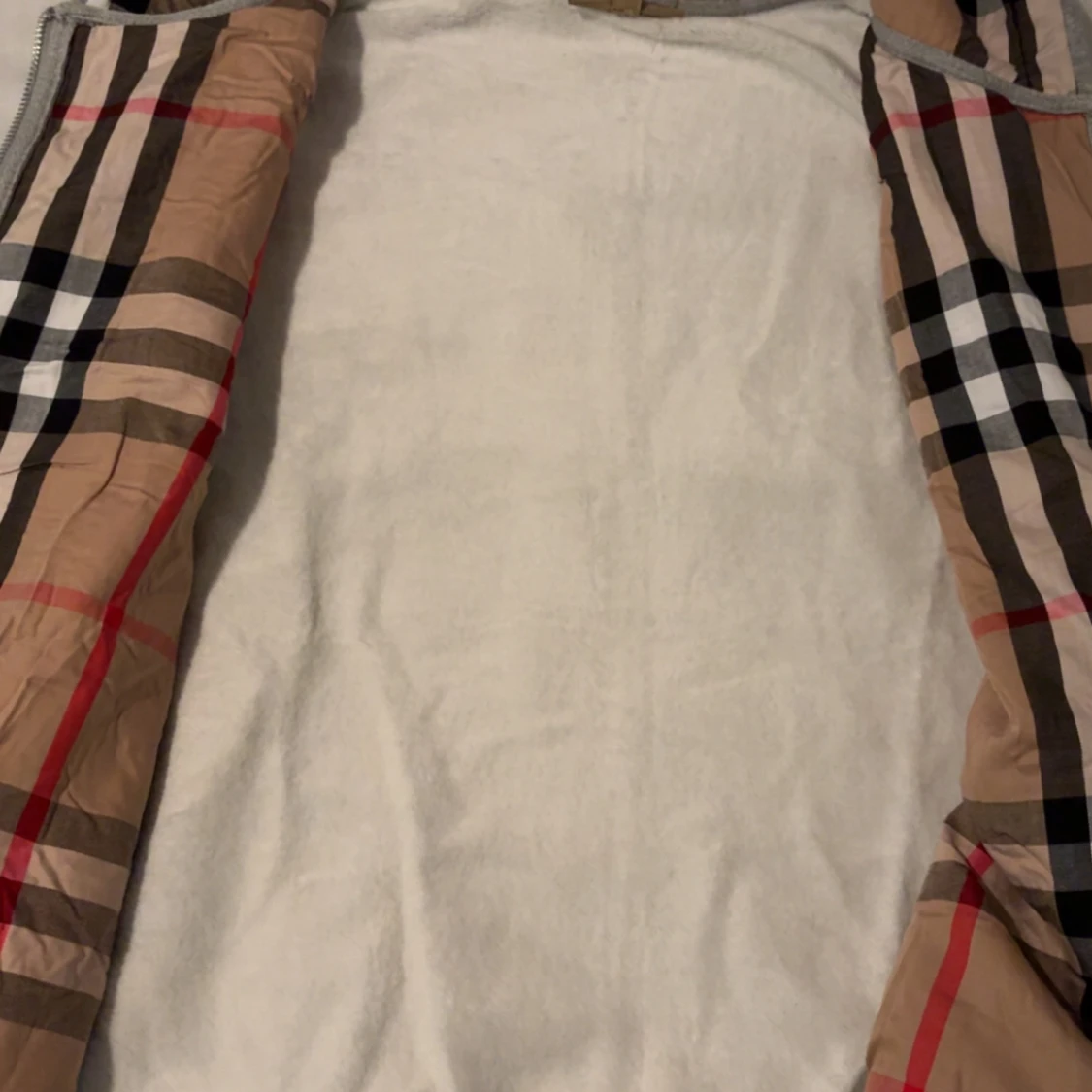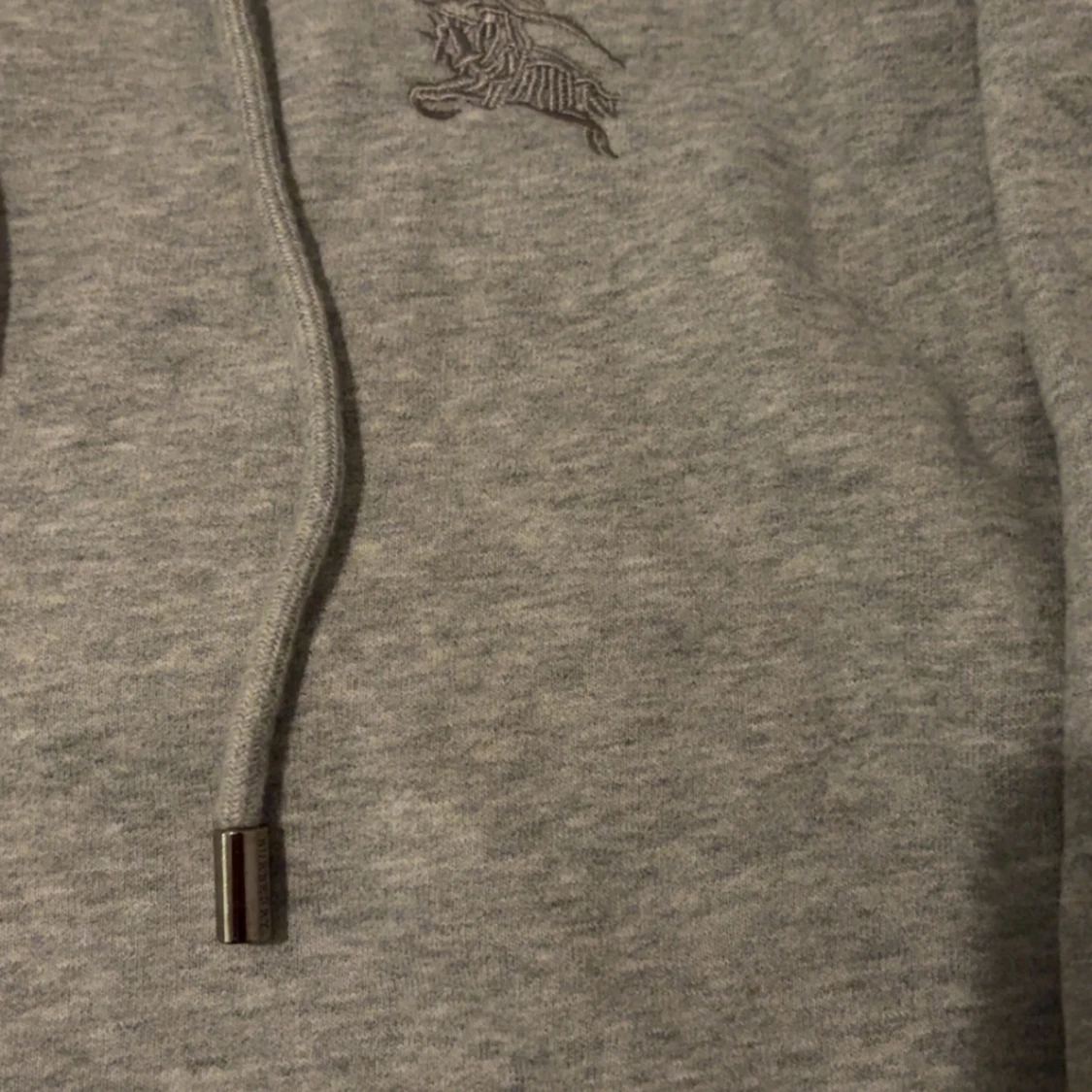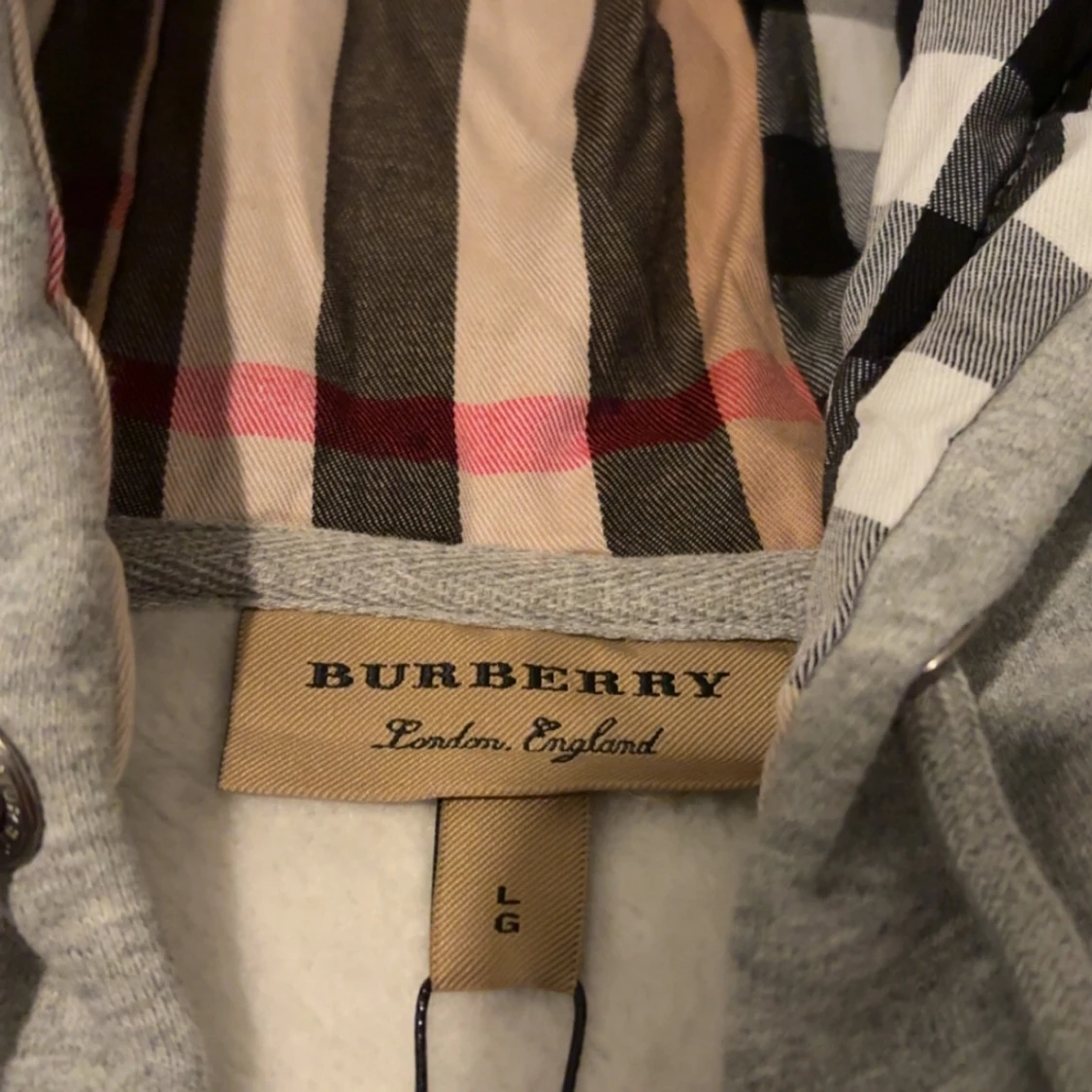 Snygg grå hoodie från Burberry med klassiskt rutigt foder i huvan och insidan. Tröjan har dragkedja, snörning i huvan och broderad logga på bröstet. Perfekt för dig som vill ha en stilren och lyxig look med streetkänsla. Säljer då den ej passar helt ny oanvänd det går o lämna tillbaka om den ej ser ny ut. Storlek L men kan tänka mig M
