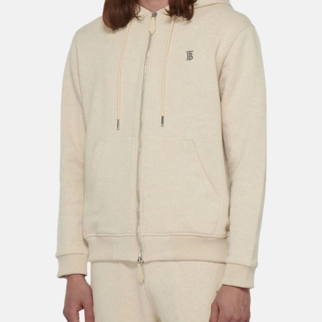 Säljer en stilren beige burberry hoodie med dragkedja framtill. Den har en klassisk passform med långa ärmar och en praktisk huva med dragsko. Perfekt för en avslappnad look!