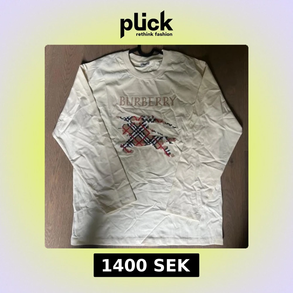 Snygg långärmad tröja från Burberry i ljus beige bomull. Framsidan har ett stort broderat Burberry-tryck och klassiskt rutig mönster i rött, svart och beige. Perfekt för dig som gillar stilrena och exklusiva plagg med en twist. Knappt använd säljes pga av att det bara sitter i garderob… Storlek M