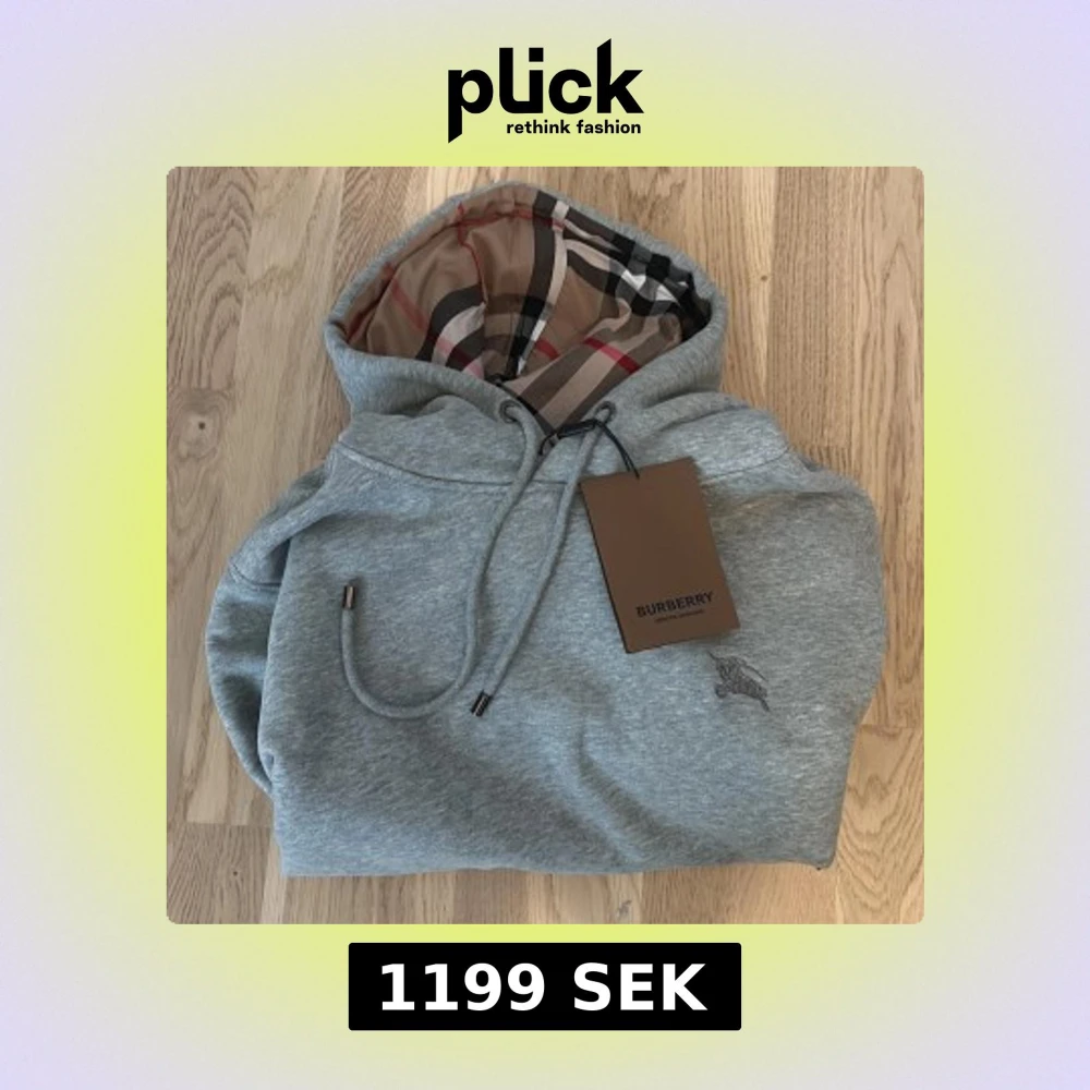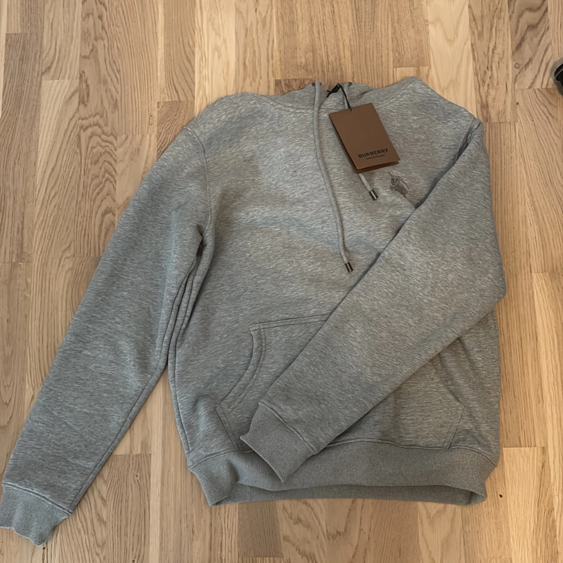 Snygg grå hoodie från Burberry i storlek M med klassiskt rutigt foder i huvan och broderad logga på bröstet. Tröjan har snörning vid huvan, ribbade muddar och en stor magficka. Perfekt för dig som gillar stilrena designer med lyxig touch.
