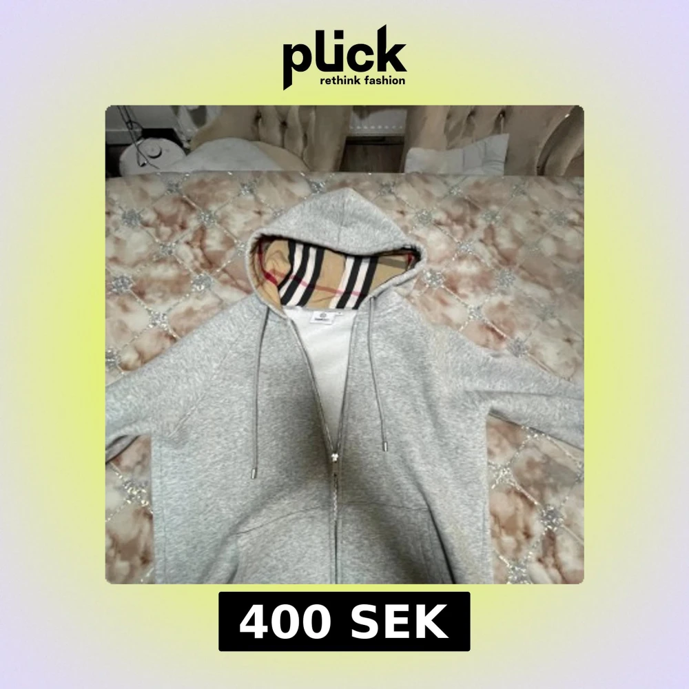 Säljer en grå hoodie från Burberry med klassiskt rutigt foder i huvan. Tröjan har dragkedja framtill, snörning i huvan och broderad Burberry-logga på bröstet. Tillverkad i mjuk bomullsmix, perfekt för chill dagar.