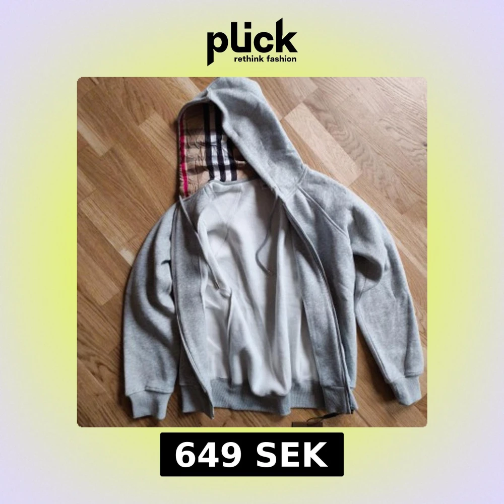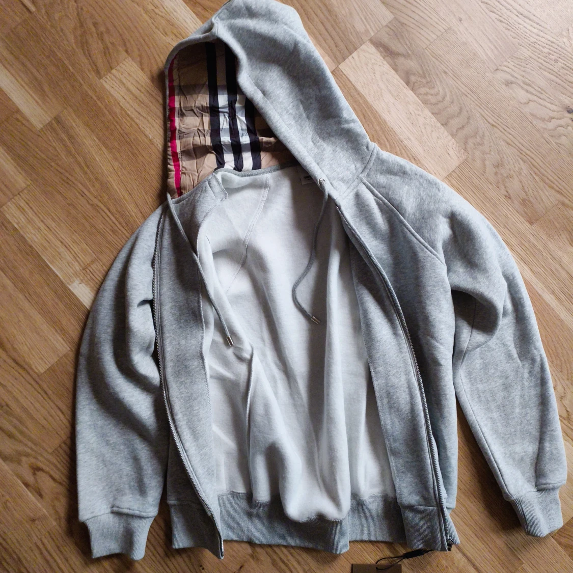 Säljer en grå hoodie från Burberry med dragkedja och snörning. Insidan av huvan har det klassiska Burberry-rutiga mönstret i beige, svart och rött. Tröjan har långa ärmar och ribbade muddar. Perfekt för dig som gillar stilrena och exklusiva detaljer.