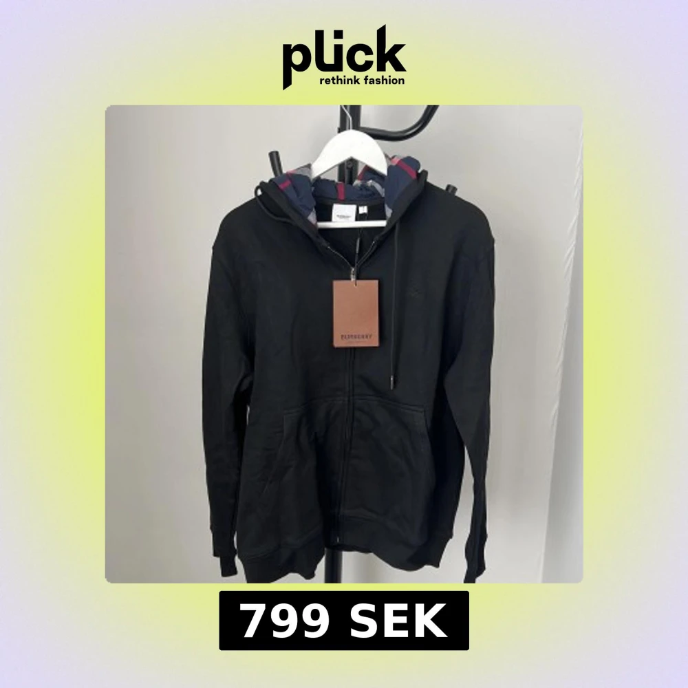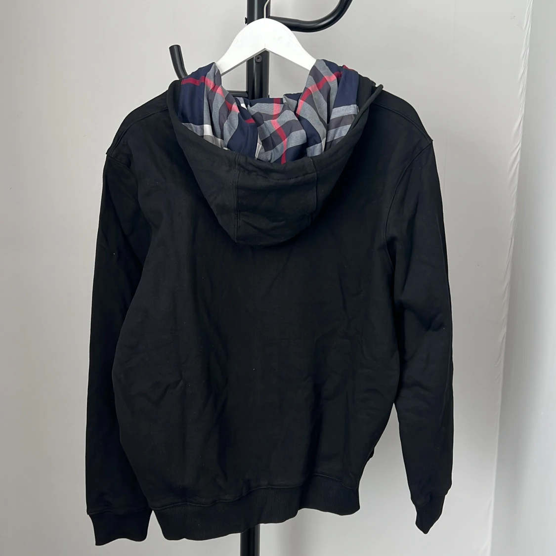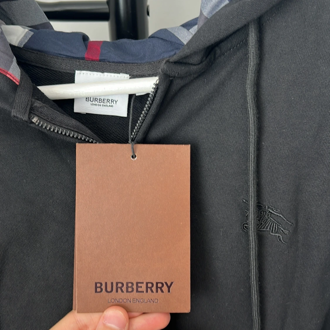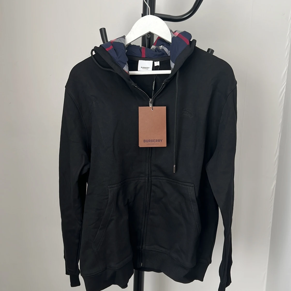 Svart hoodie från Burberry med dragkedja och klassisk logga broderad på bröstet. Huvan har Burberrys ikoniska rutiga mönster i blått, grått och rött. Tröjan har känguruficka och ribbade muddar. Perfekt för dig som gillar stilrena streetwear-plagg.