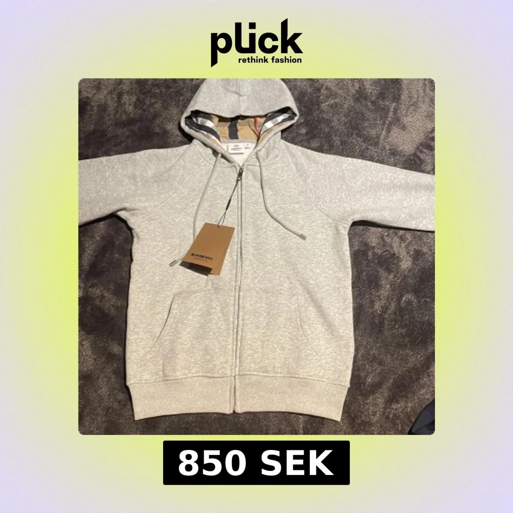 Snygg ljusgrå hoodie från Burberry med klassiskt rutigt foder i huvan och broderad logga på bröstet. Tröjan har hel dragkedja, snörning i huvan och två fickor framtill. Perfekt för dig som vill ha en stilren och exklusiv look.