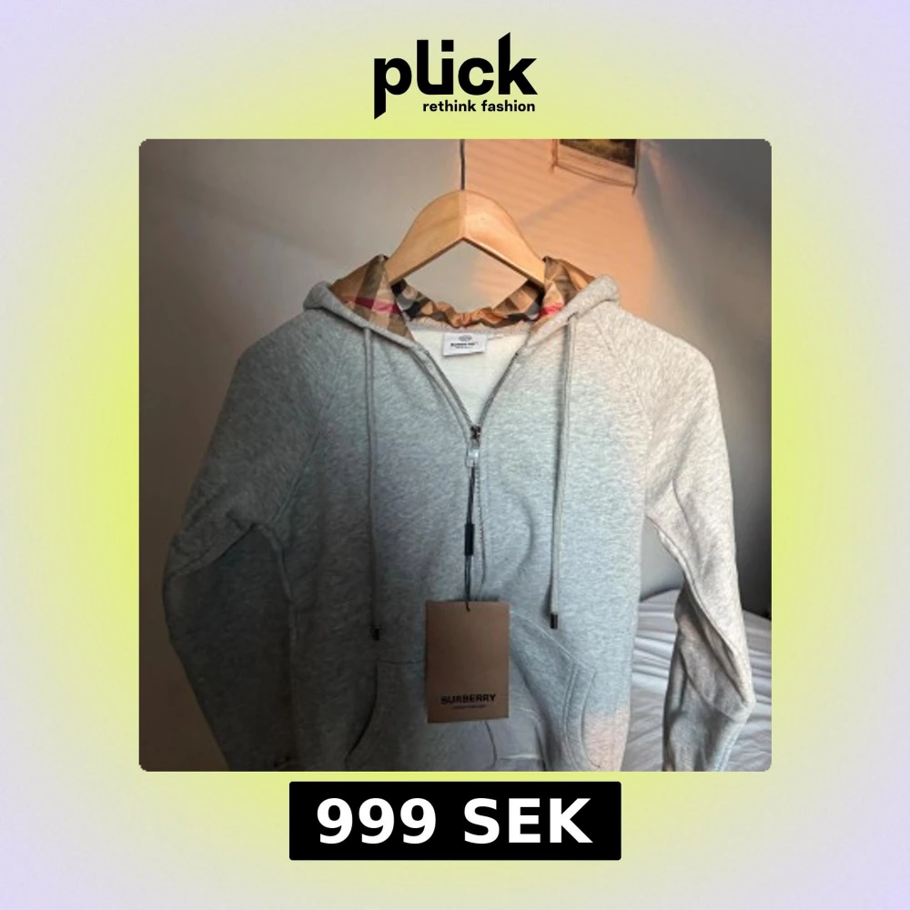 Snygg grå hoodie från Burberry med klassiskt rutigt foder i huvan. Tröjan har dragkedja framtill, snörning vid huvan och känguruficka. Perfekt för dig som gillar stilrena och exklusiva plagg med en twist.