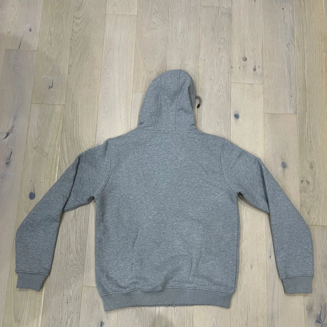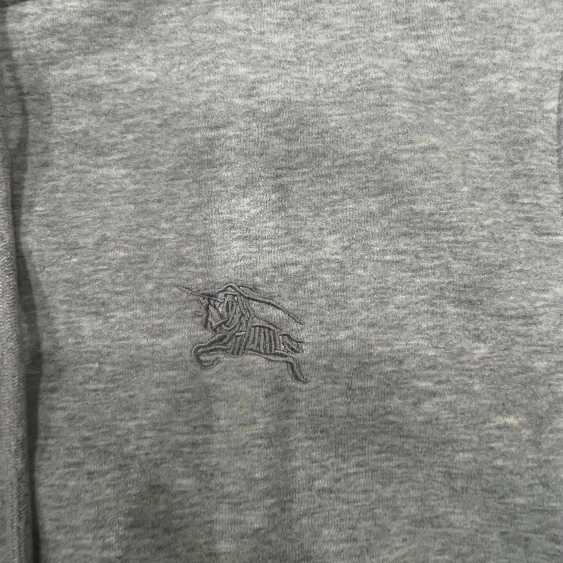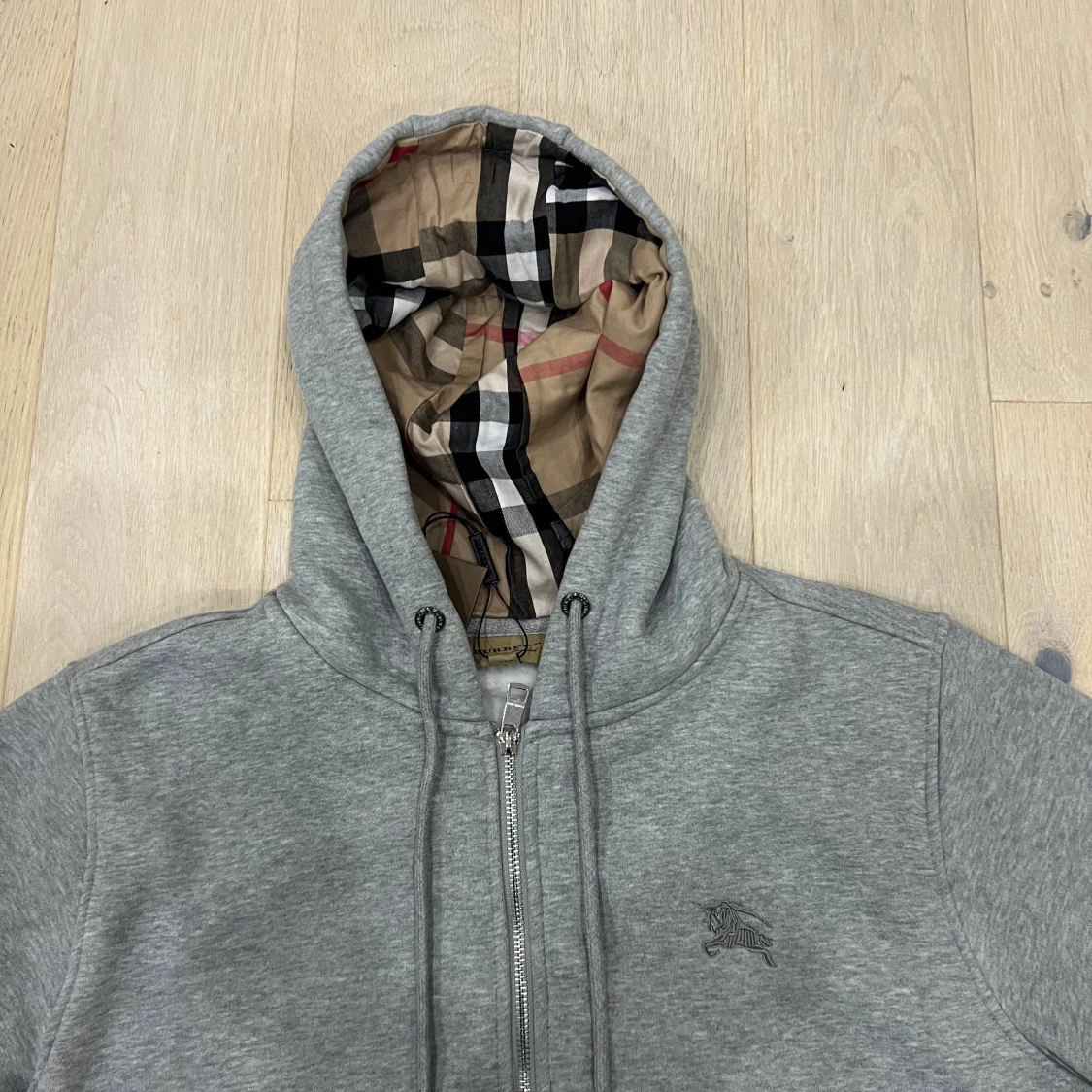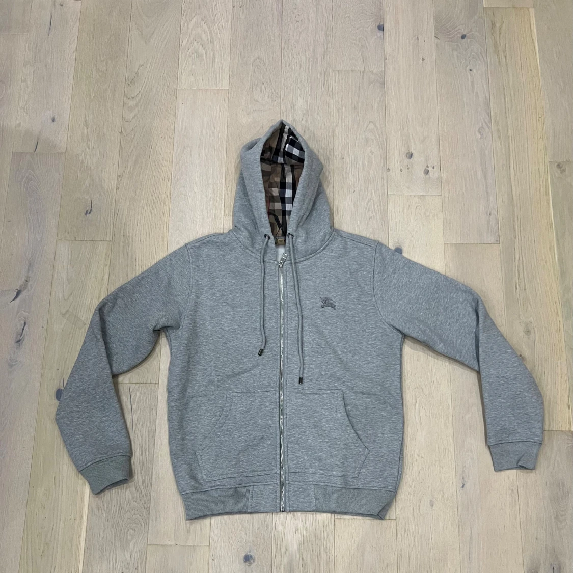 Säljer en grå hoodie från Burberry med dragkedja och klassiskt rutigt foder i huvan. Tröjan har snörning i huvan, broderad logga på bröstet och två fickor framtill. Perfekt för dig som vill ha en stilren och lyxig streetwear-look.