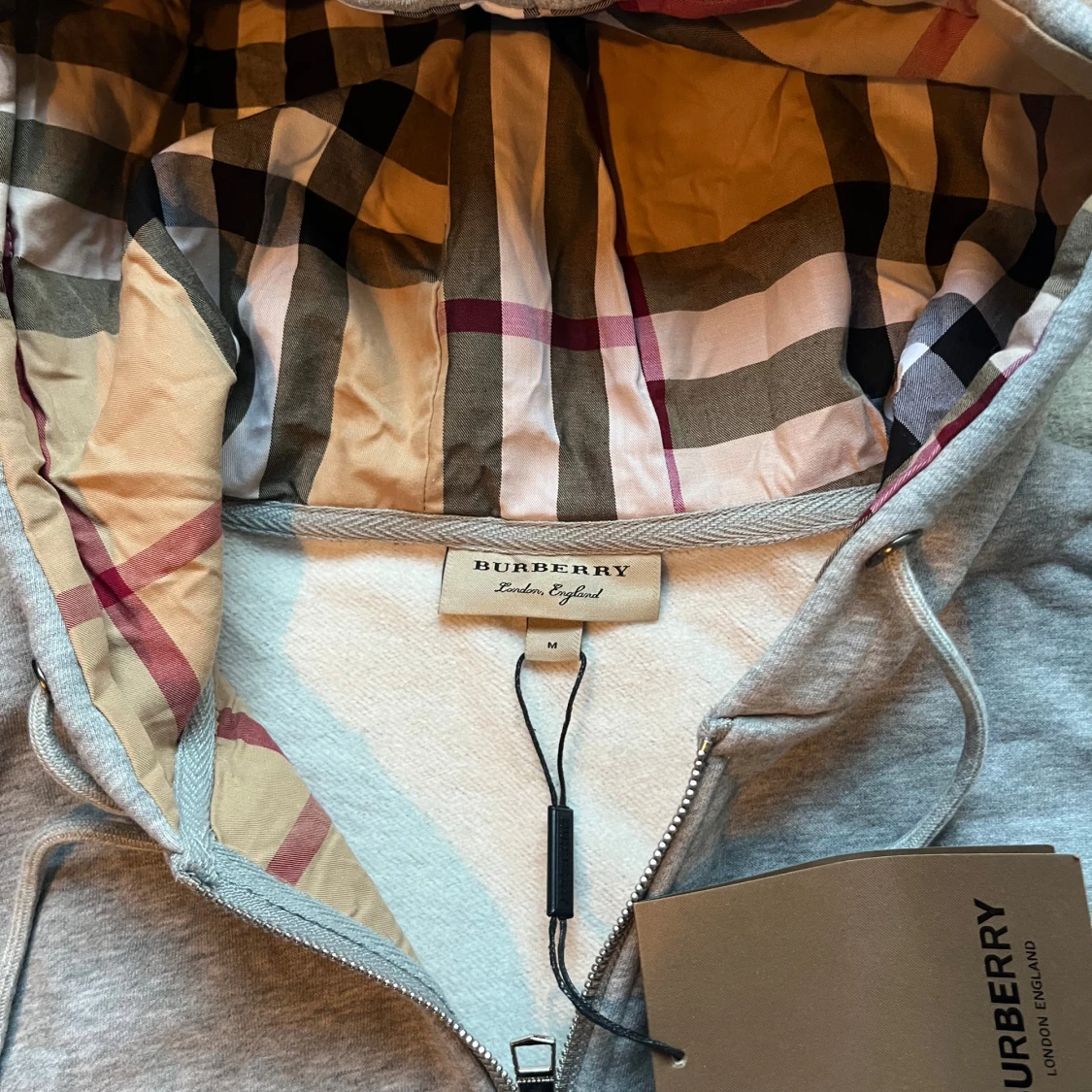 Snygg grå hoodie från Burberry med klassiskt rutigt foder i huvan och broderad logga på bröstet. Tröjan har dragkedja framtill, snörning i huvan och två fickor. Perfekt för dig som vill ha en stilren och exklusiv look.