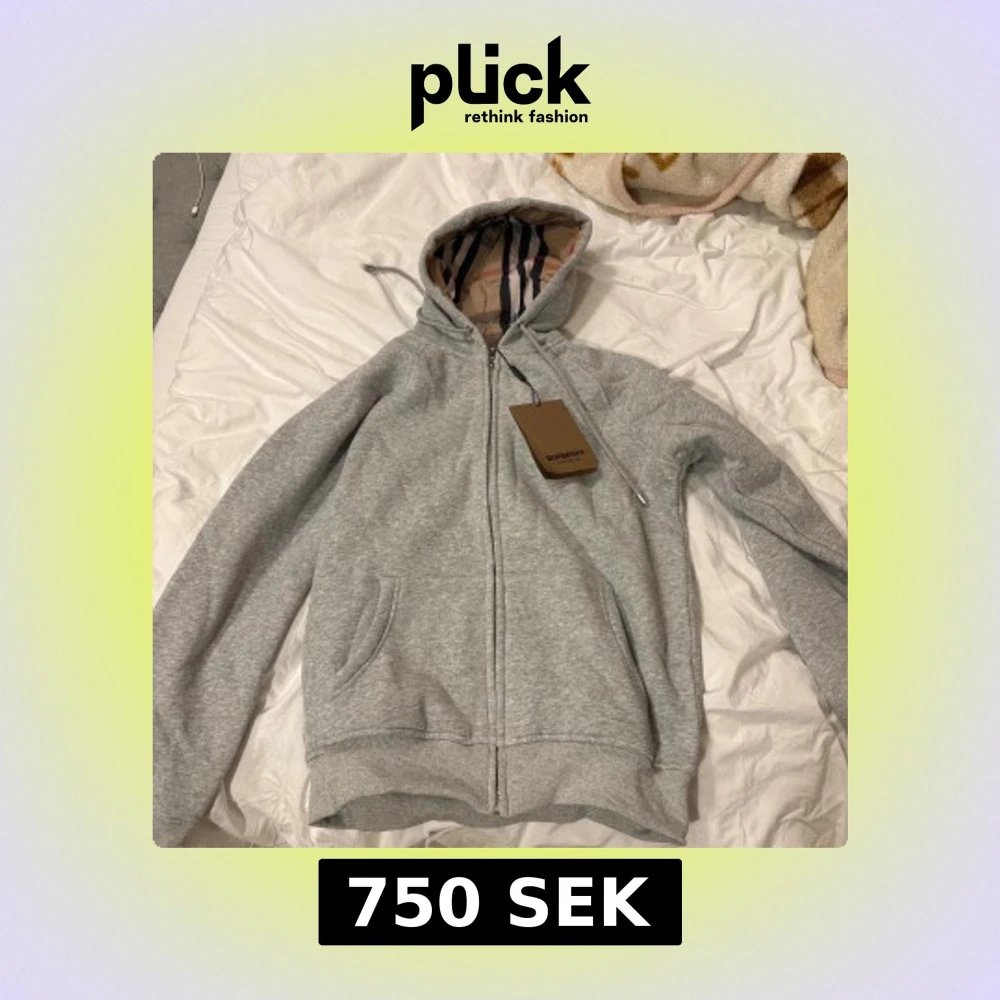 Grå hoodie från Burberry med klassisk rutmönstrad huva och snörning. Tröjan har dragkedja framtill, två fickor och ribbade muddar. Insidan är mjuk och skön, perfekt för chill dagar. Ikonisk Burberry-tag kvar på plagget.