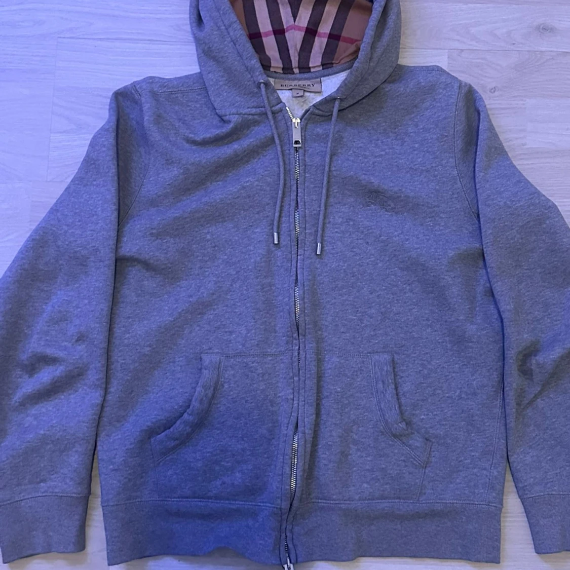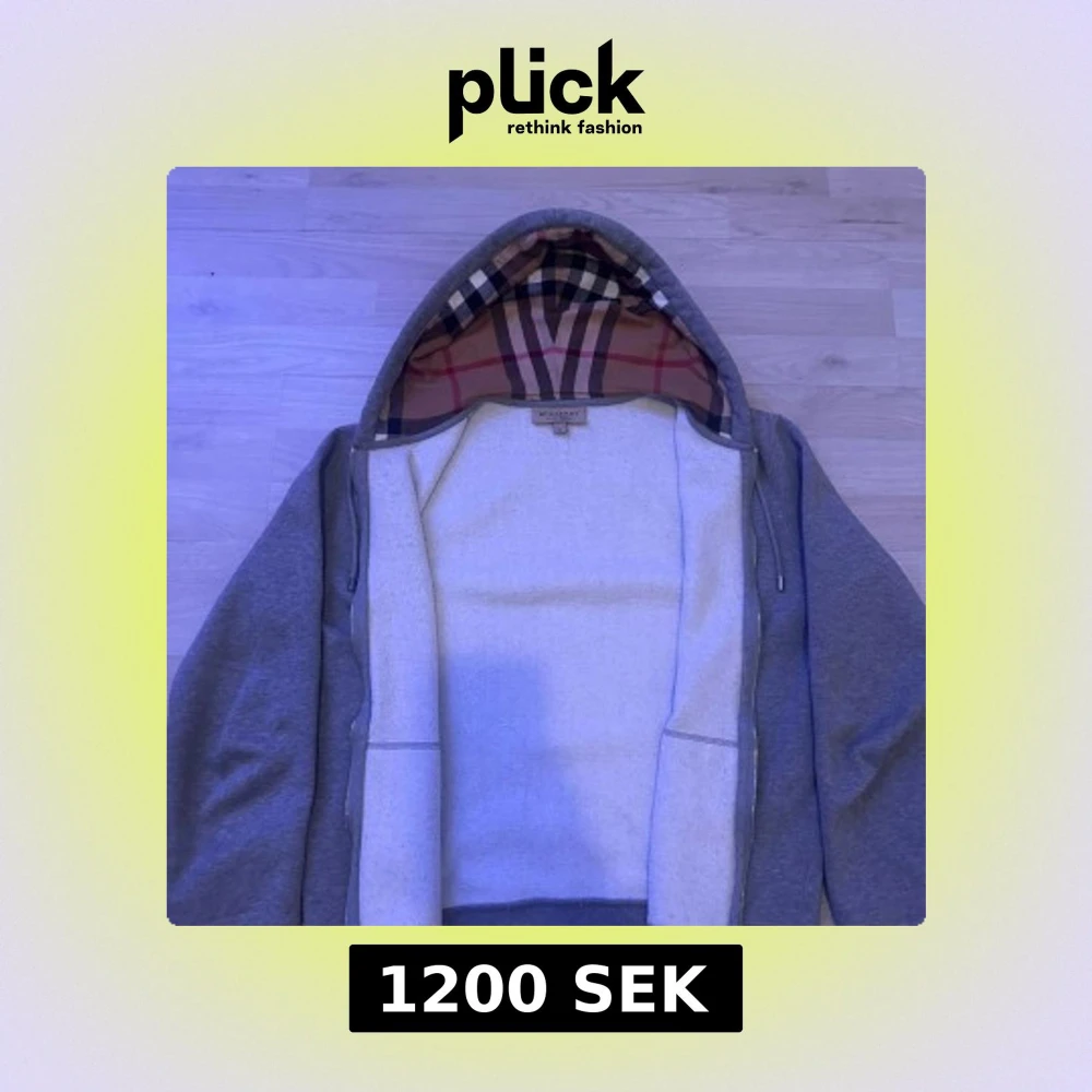Säljer en grå hoodie från Burberry i storlek M. Tröjan har klassiskt rutigt foder i huvan, snörning och dragkedja framtill. Två fickor på magen och ribbade muddar vid ärmslut och nederkant. Perfekt för dig som gillar stilren design med lyxig touch.