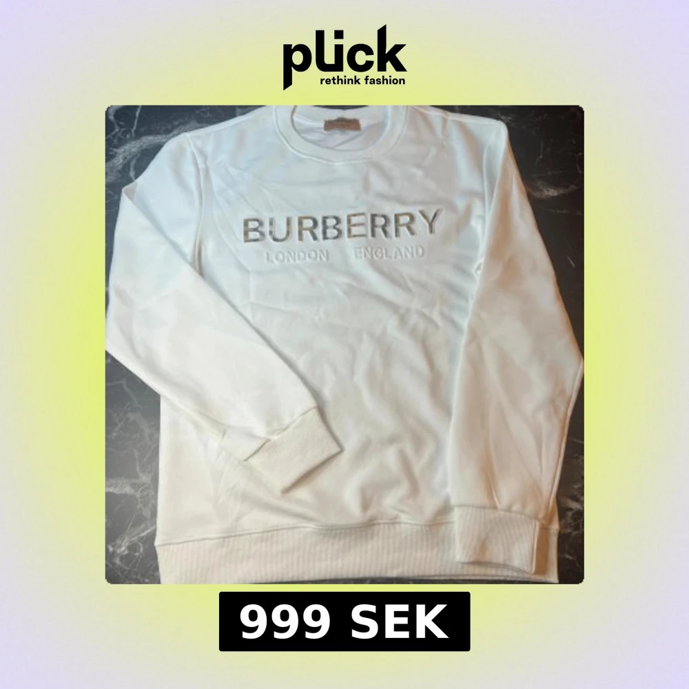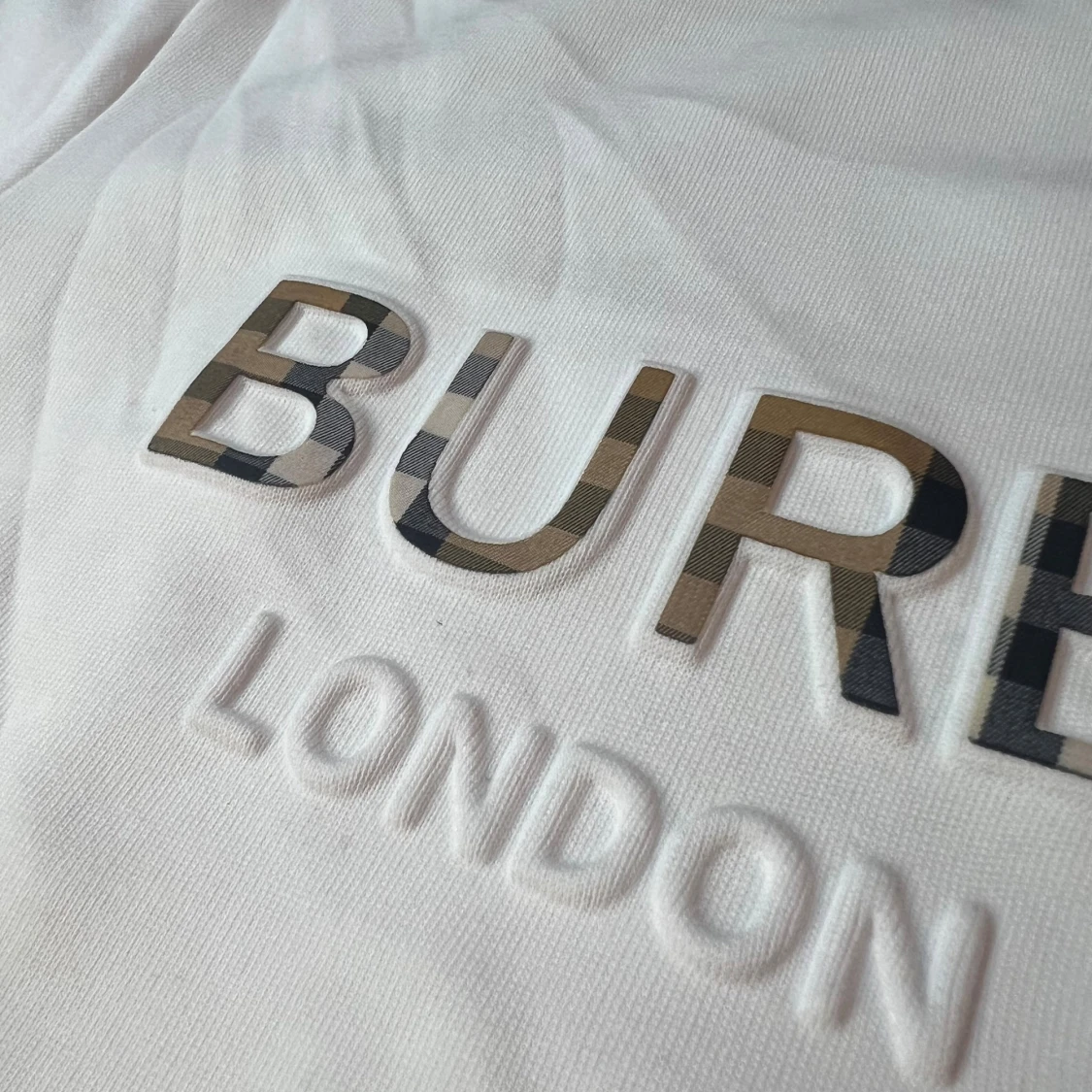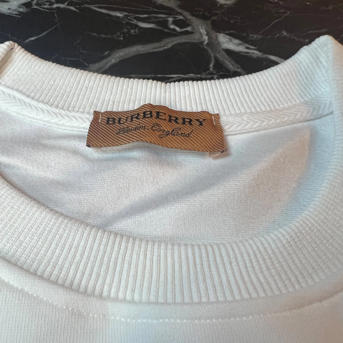 Säljer en vit sweatshirt från Burberry med klassisk logga och texten 'London England' framtill. Tröjan har långa ärmar, rund halsringning och ribbade muddar. Loggan har Burberrys ikoniska rutiga mönster i bokstäverna. Använt bara en gång