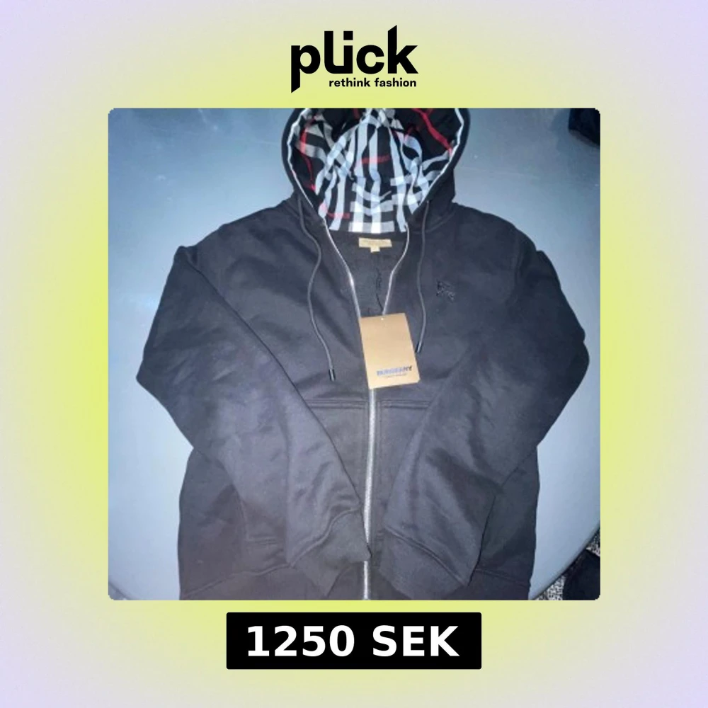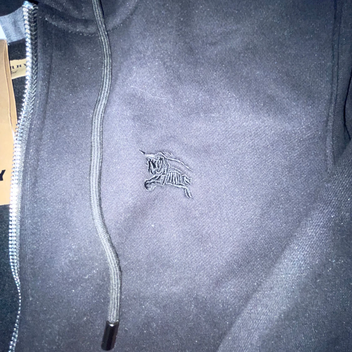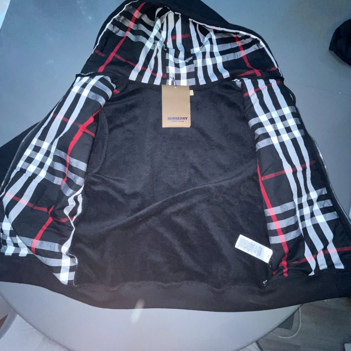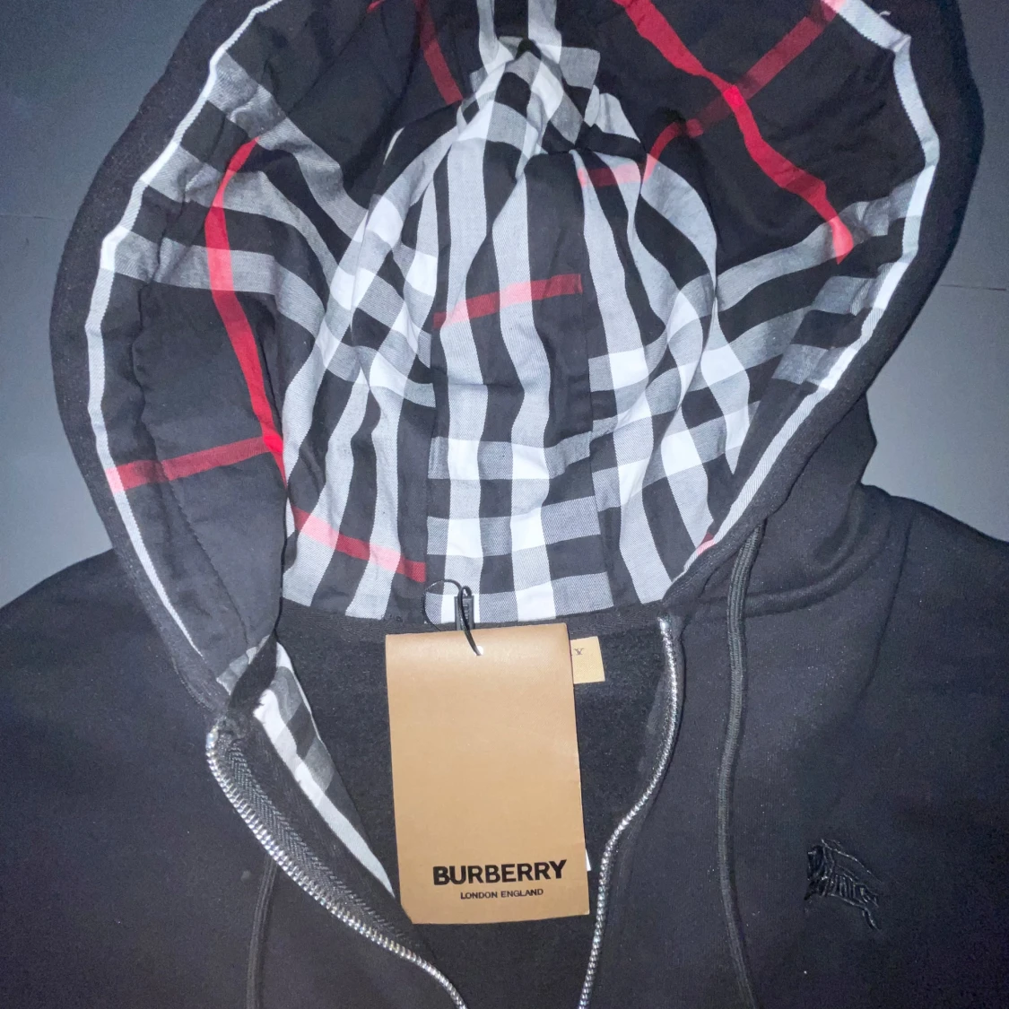 Svart hoodie från Burberry med dragkedja och klassisk rutig huva i svart, vitt och rött. Broderad logga på bröstet och snörning i huvan. Perfekt för dig som vill ha en stilren och lyxig streetwear-look.