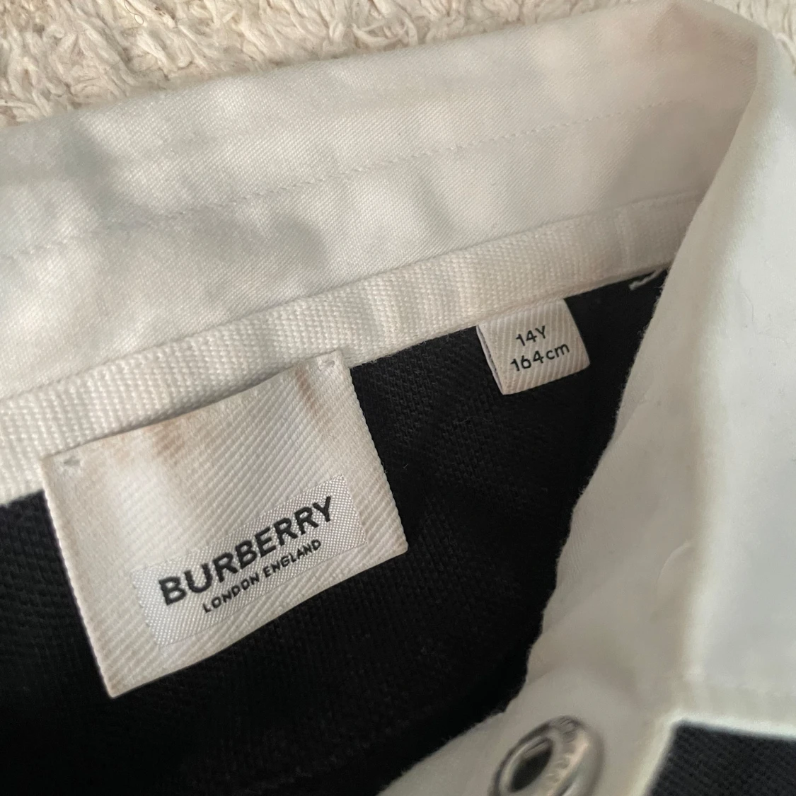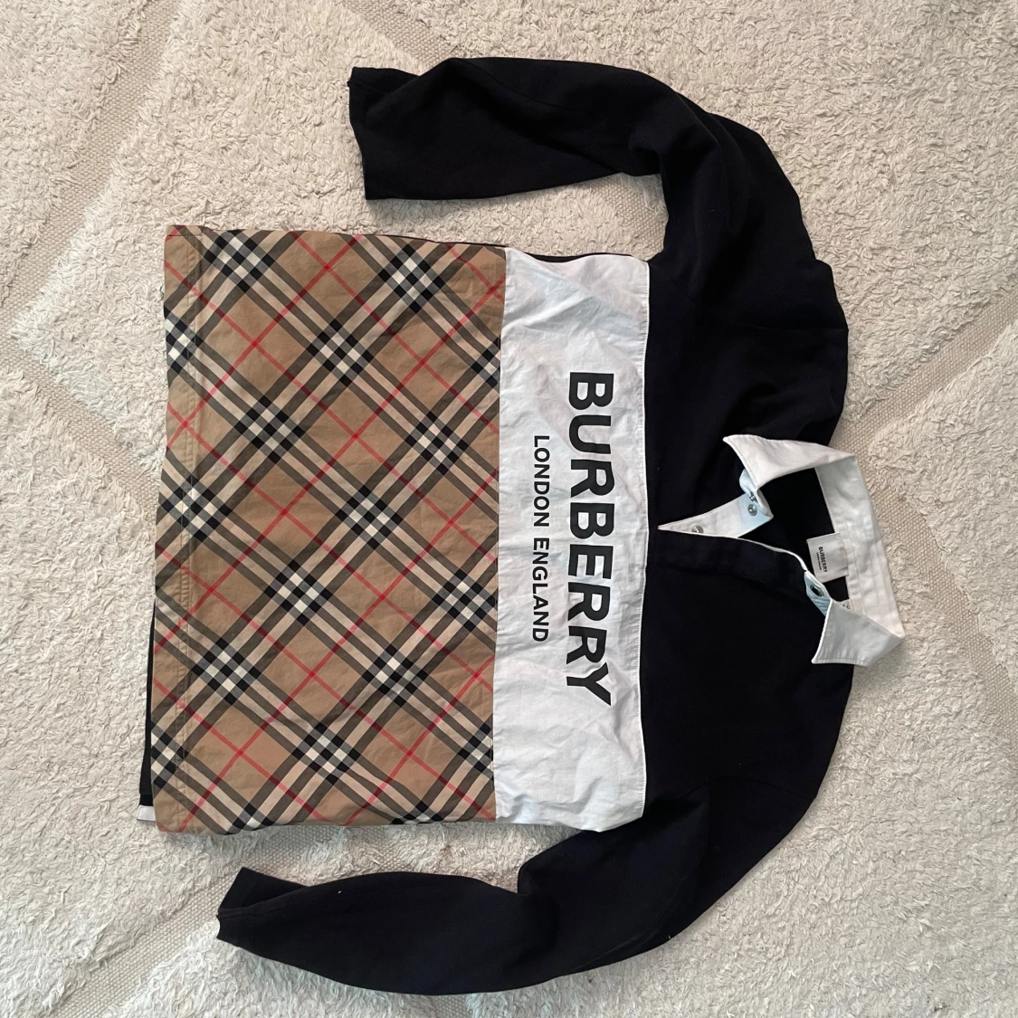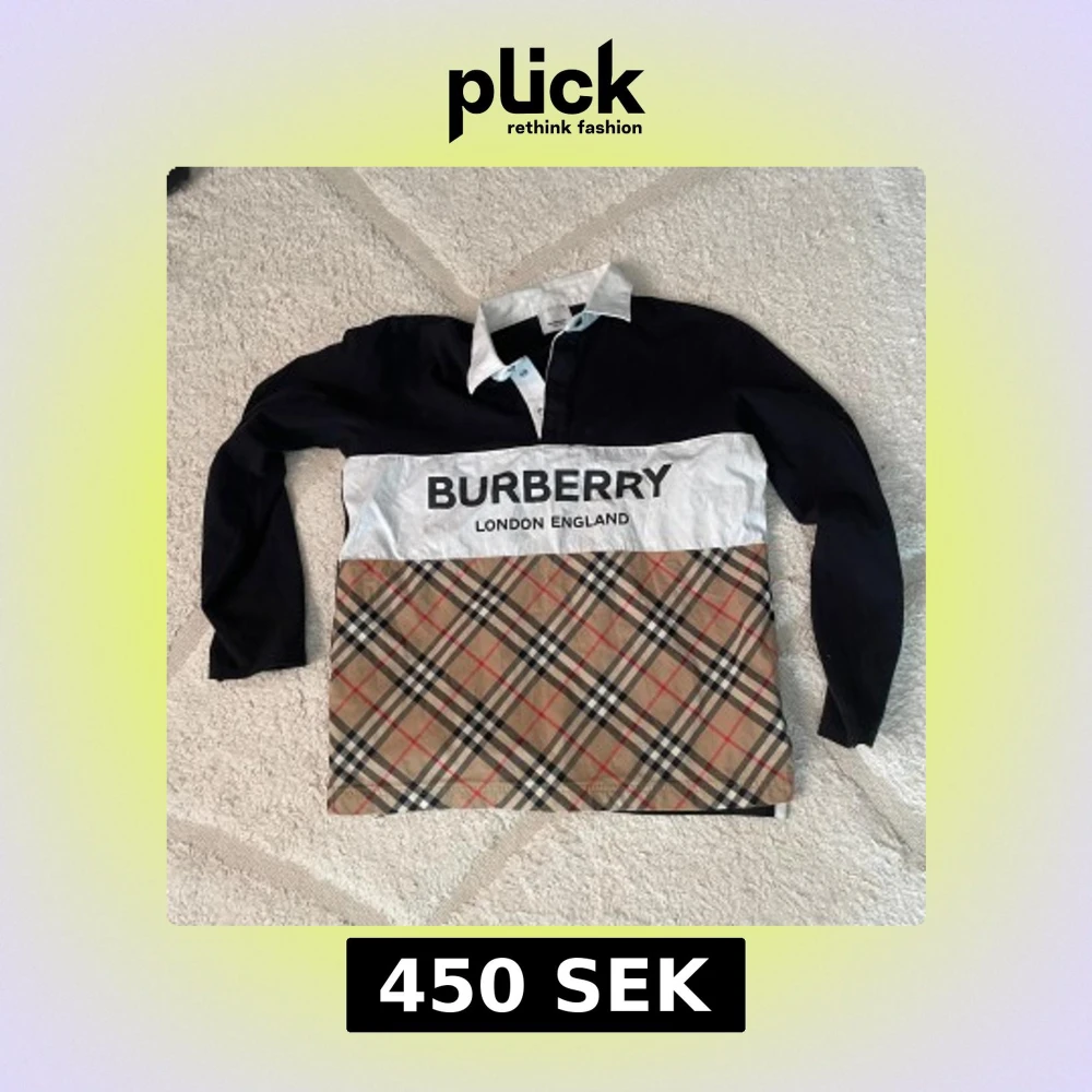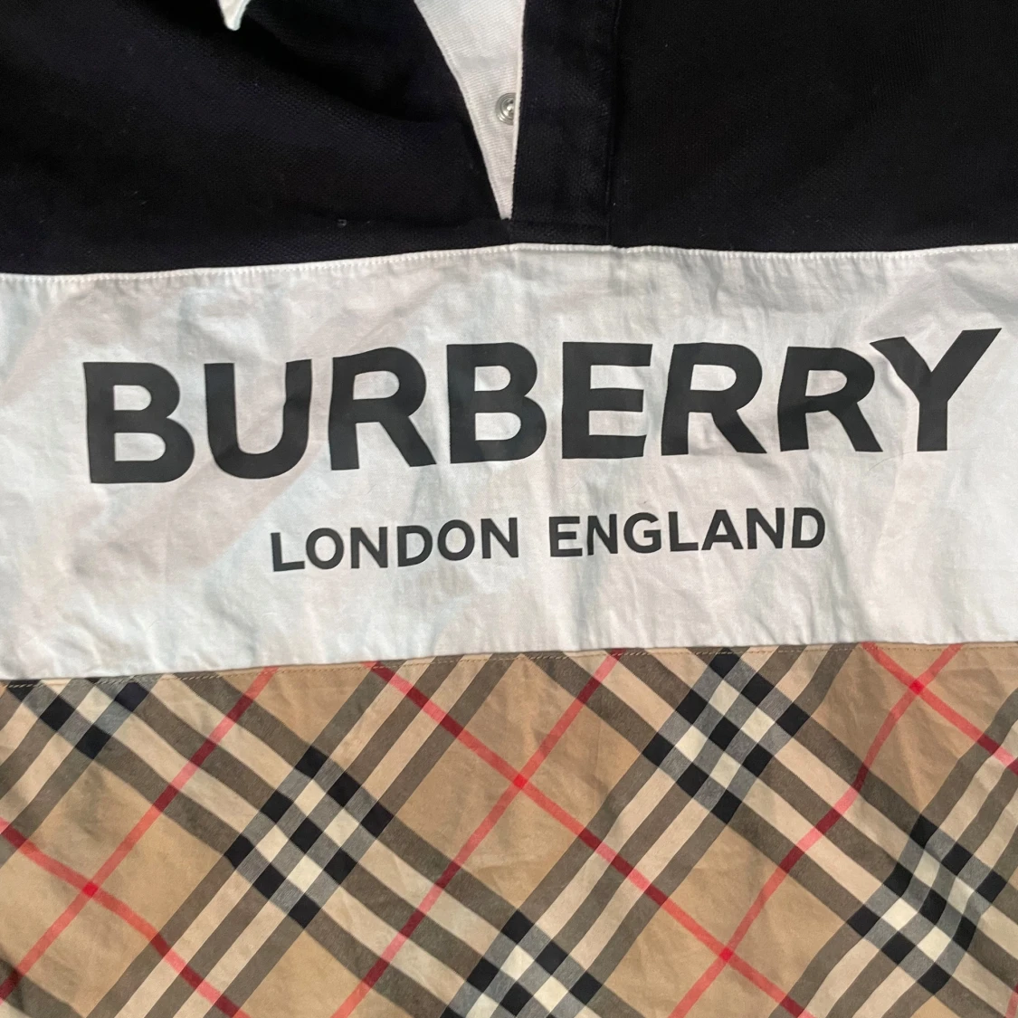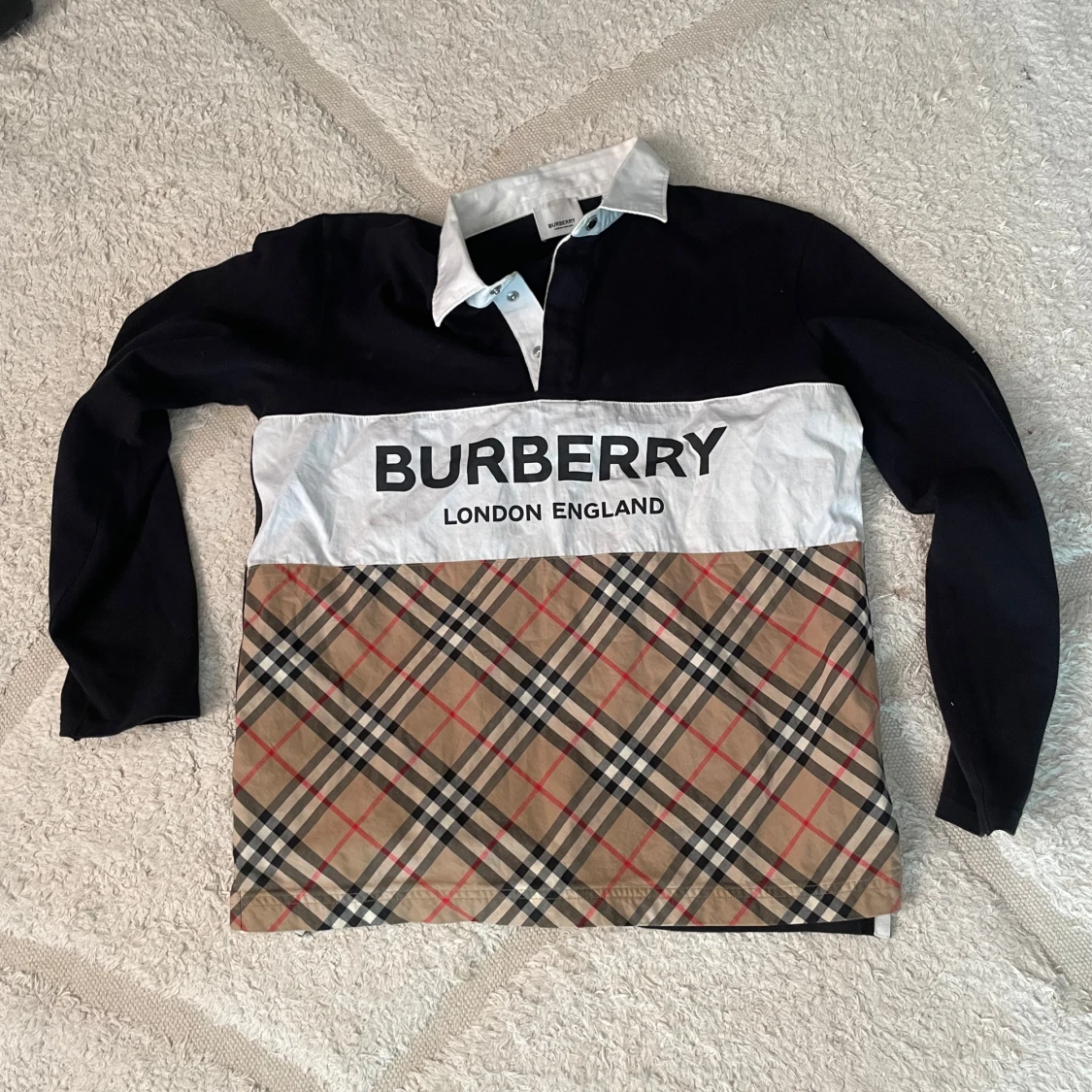 Säljer en stilren Burberry tröja med det ikoniska rutmönstret i beige, svart och rött. Tröjan har en vit krage och texten 'Burberry London England' tryckt på bröstet. Perfekt för den som vill ha en klassisk look med en modern twist.